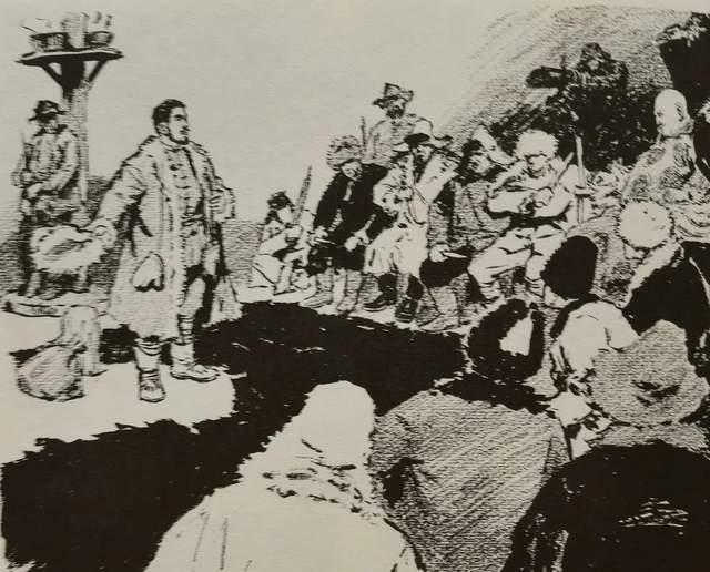 这天天刚刚亮,外头狗叫个不停。村里老耿头在村外捡粪,遇到两个戴狗皮帽子拿枪的人。其中一个长胡子的人问他: “老大爷站一下。别害怕,我们是黑牛背的,胡子打你没有?”