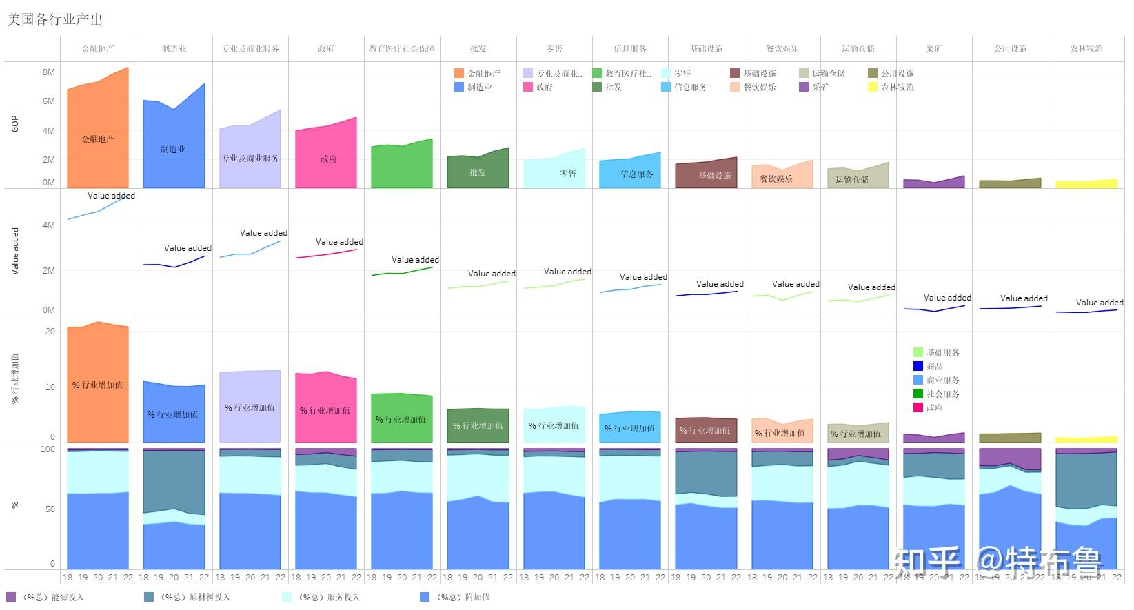 如果按照行业总产出规模计算,中国可能在10年前就已经超过美国了。在美国的经济结构中,制造业占总产出的比重在15%左右,占行业附加值(GDP)的比重为10%左右。之所以产出规模占比较高,是因为制造业产出中,原材料占比较高(超过了50%)。