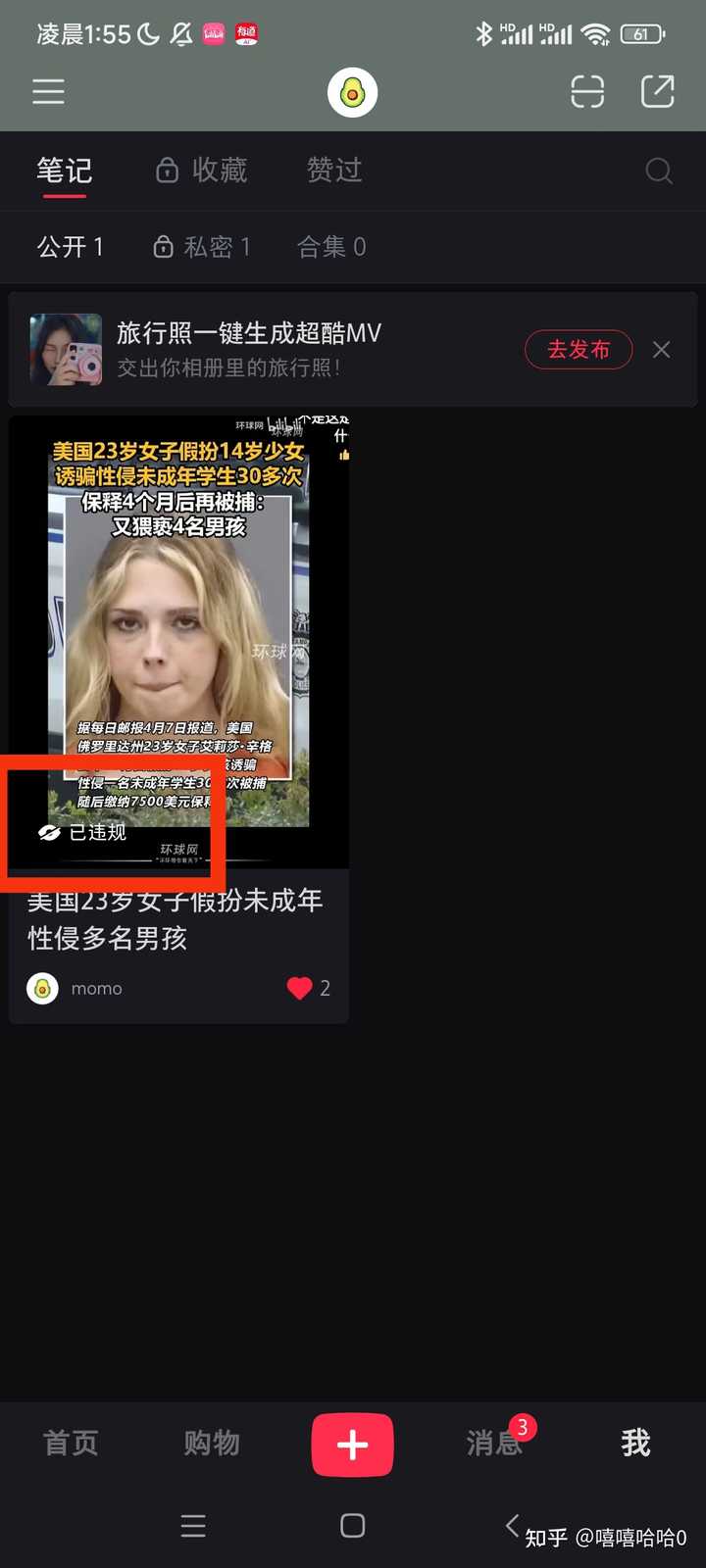 我迫不及待又用新号试了一下,果不其然,但凡发 对女性不利的新闻,无论国内外,都会被当成违规处理,然后被删。