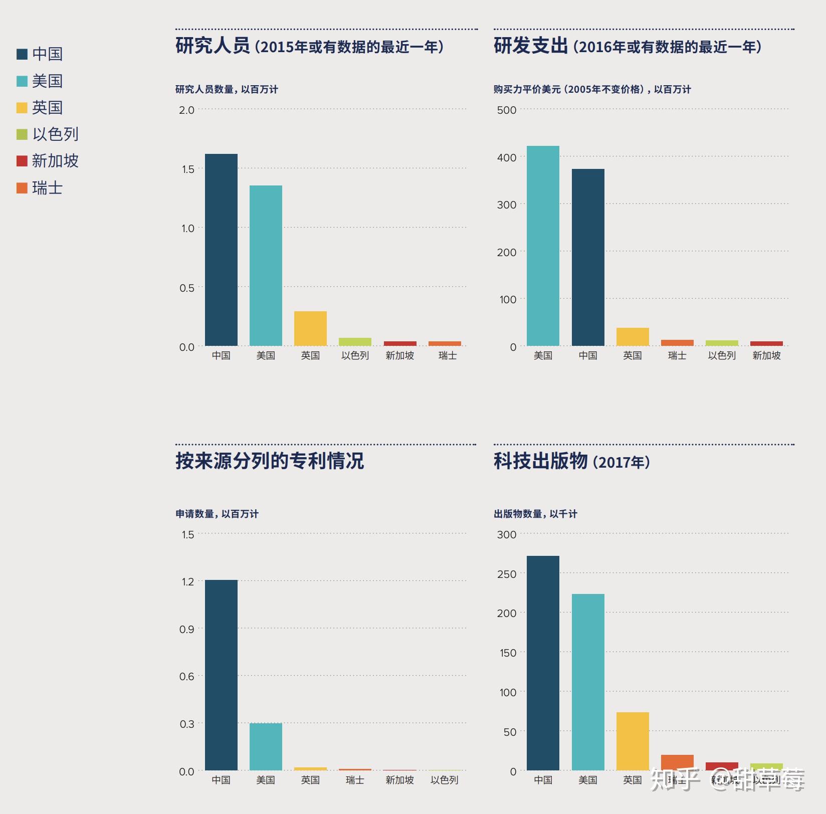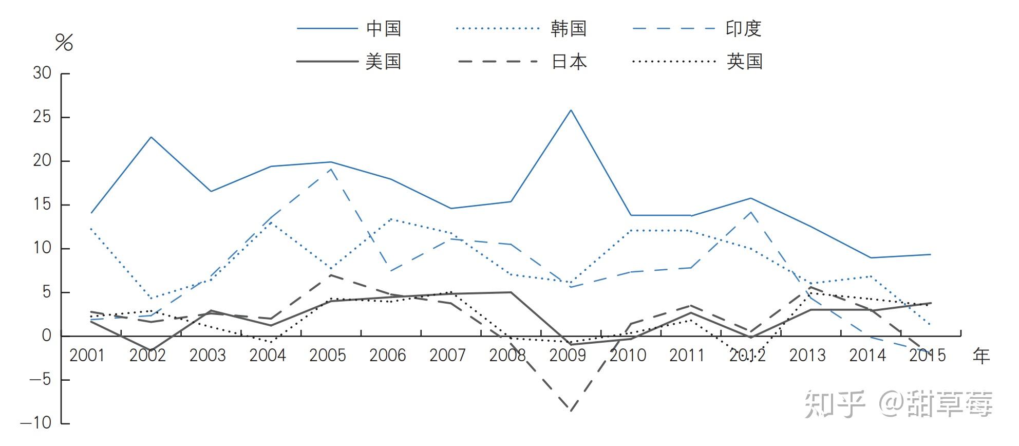 部分国家R&D经费增速(按不变价计算)(《国家创新指数报告 2016—2017》) 研究人员,支出,专利,论文均占世界前二(日本既视感),