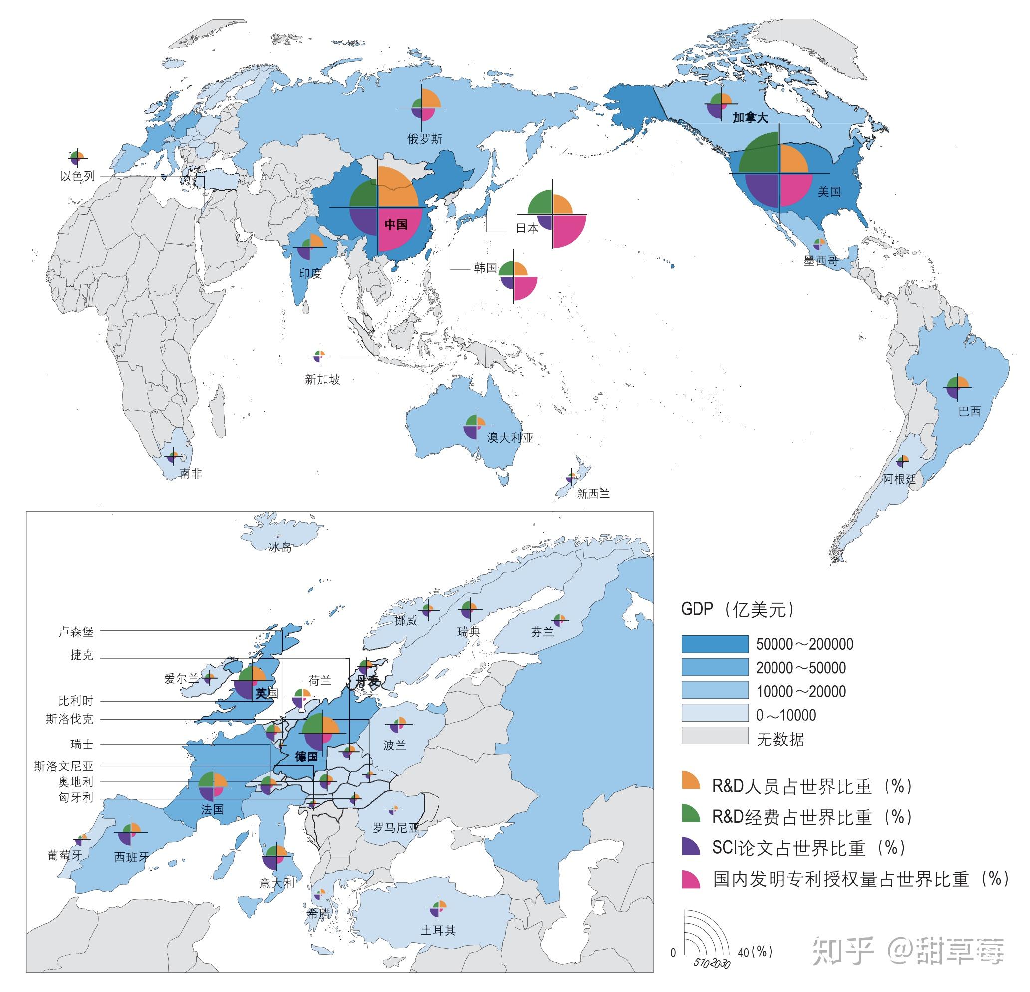 知识创造能力稳步提升。国际科技论文数量居世界第2位;国内发明专利申请量保持世界第1位;国内发明专利授权量已超越日本,居世界第1位。科技对经济发展贡献日益显著。科技进步贡献率稳步提升,已达到55.3%;R&D经费投入强度达到2.06%,与创新型国家的差距进一步缩小;知识密集型产业 保持良好发展态势,产业结构持续优化。GDP、R&D人员、R&D经费、SCI论文与国内发明专利授权量世界分布(《国家创新指数报告 2016—2017》) 同时R&D经费投入增长也领跑全球,