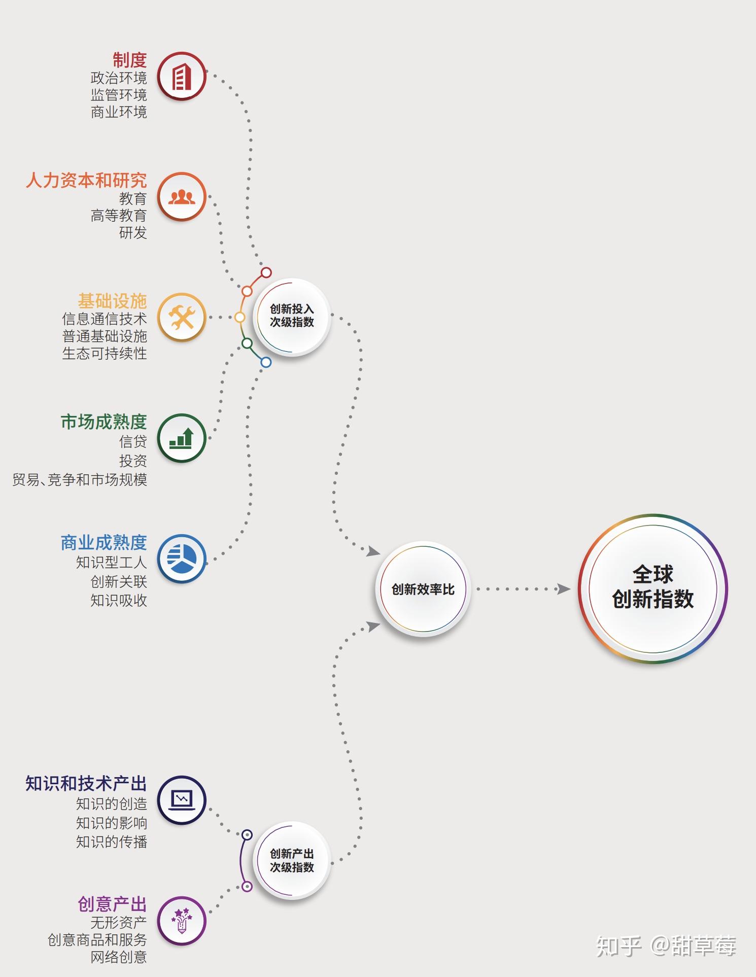 可以看到,主要的劣势在监管、高等教育、生态可持续性、信贷、投资、海外投资、创意服务部分。可能有人会想知道世界知识产权组织的评估框架是什么,我这里也贴一下: