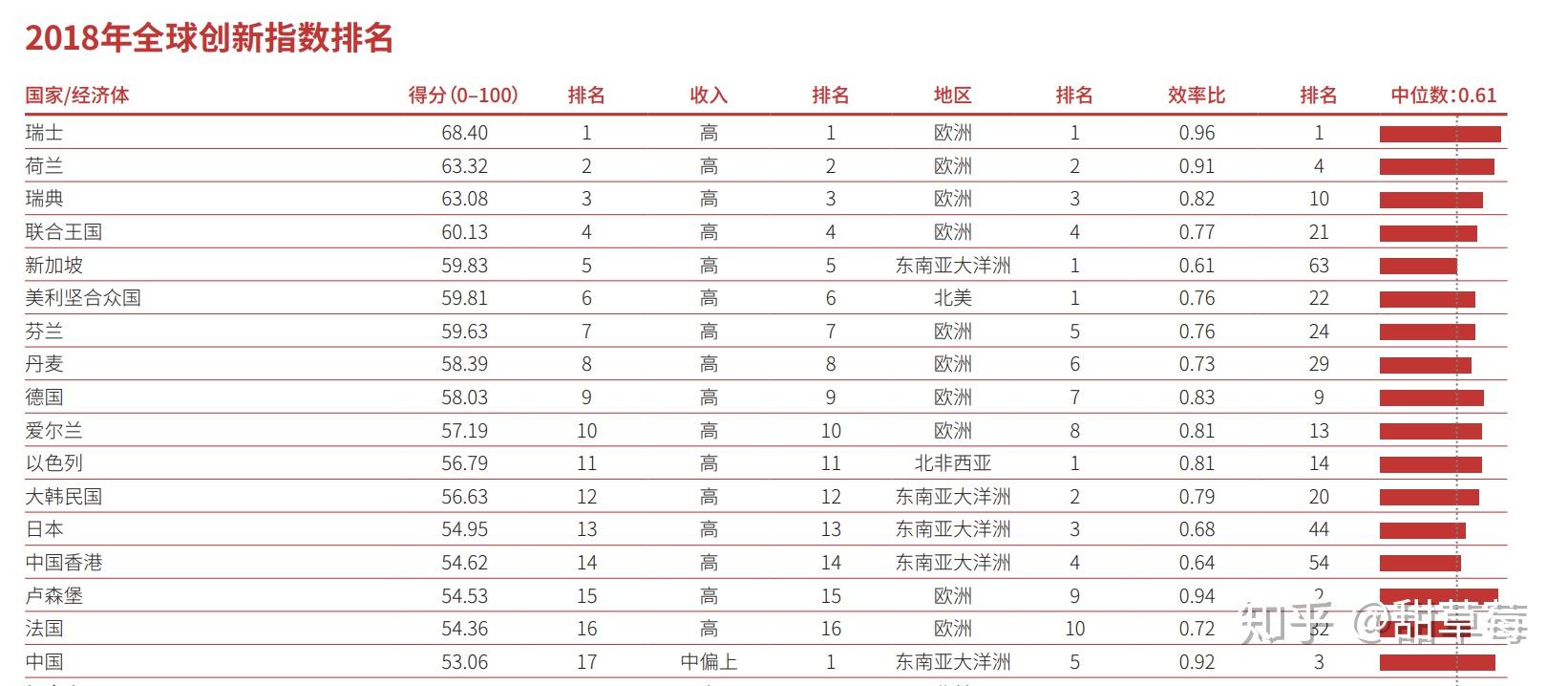 创新指数世界排名第17,按照组别排序的话,在人均收入中等偏上的组别中排名第一。