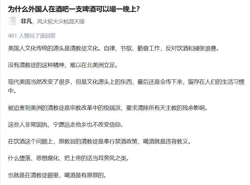 为什么“外国人在酒吧一支啤酒可以嘬一晚上”和美国人是清教徒所以不喝酒联系在一起?