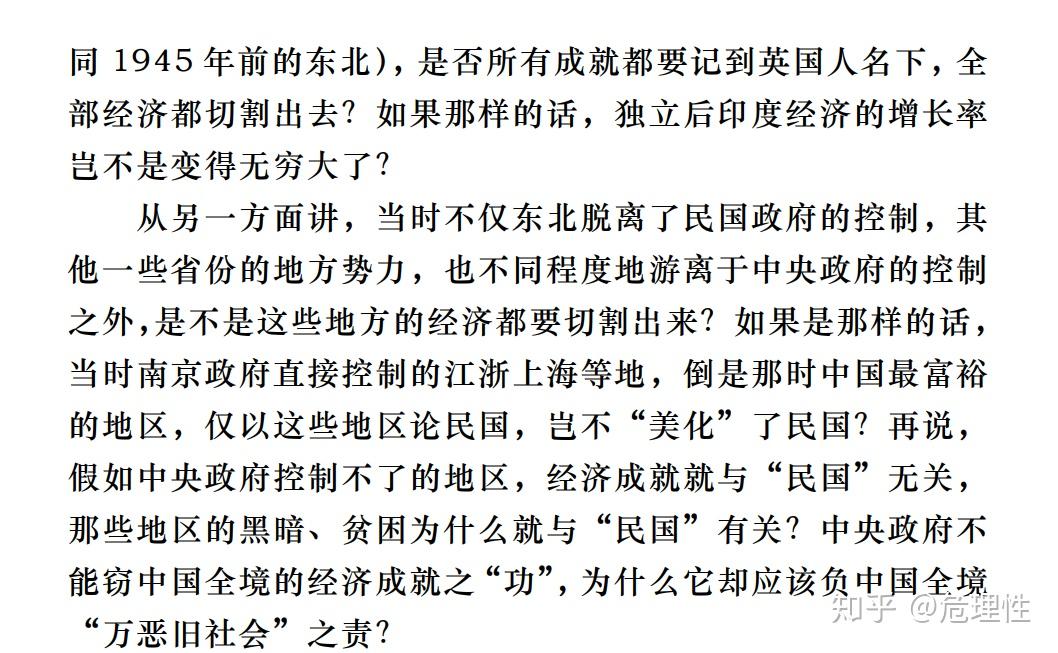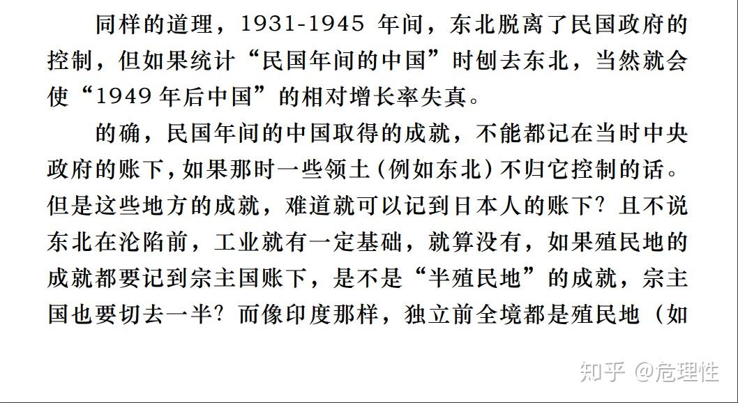 他佬关于其他方面的观点暂且不论,翻书的时候看到他佬关于日占伪满洲国时期的经济发展也需要算入民国总体经济进步的部分,论证过程十分震撼。 他佬的逻辑自不自洽诸位自行鉴别,但我相信哪怕中国当时被瓜分成数块,只要最后再次统一,那么殖民阶段的发展就能够完全正当化,这不就是典型的 现在决定过去 的视角。 至于我们那些为了达成这些所谓的“成就”,而被日寇当作奴役、杀害的先辈们,怕是完全不管他佬的这一段论证,直接干他佬就完事了。 立场的差异和逻辑能不能自洽是两回事。 编辑于 2020-06-23 22:54 赞同 32157 条评论分享 收藏喜欢 收起