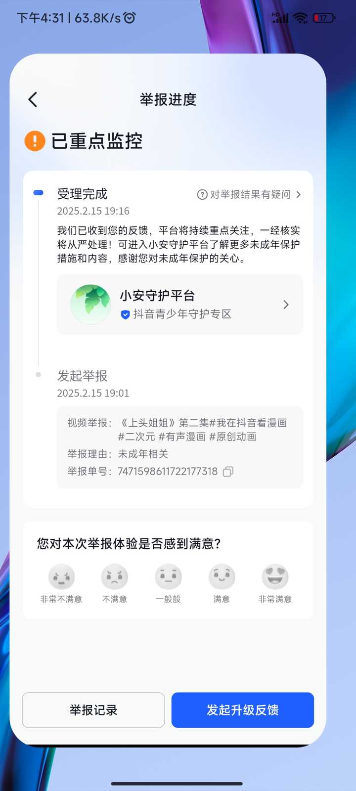事实上,DY上这种乱伦设定的动画非常多,我举报后的反馈基本都是一样,没有效果,继续存在。