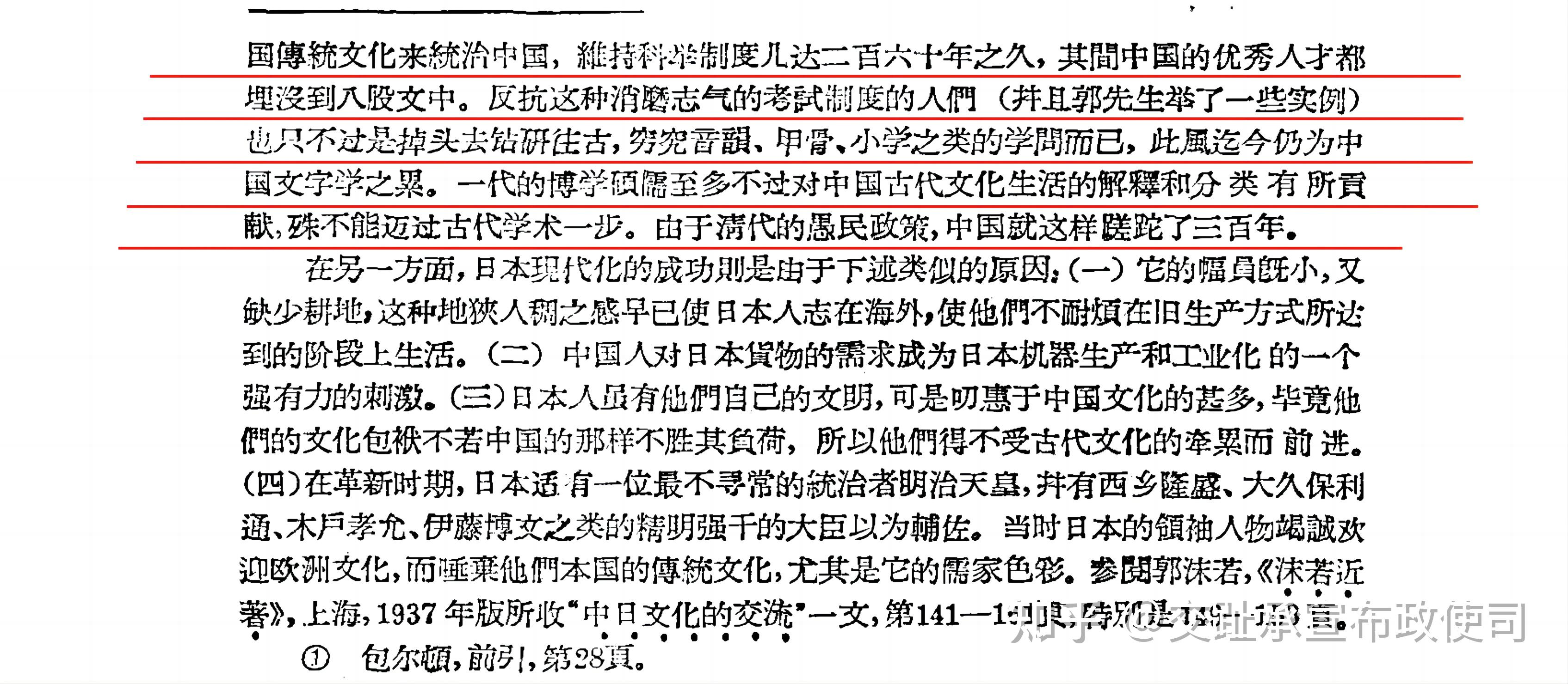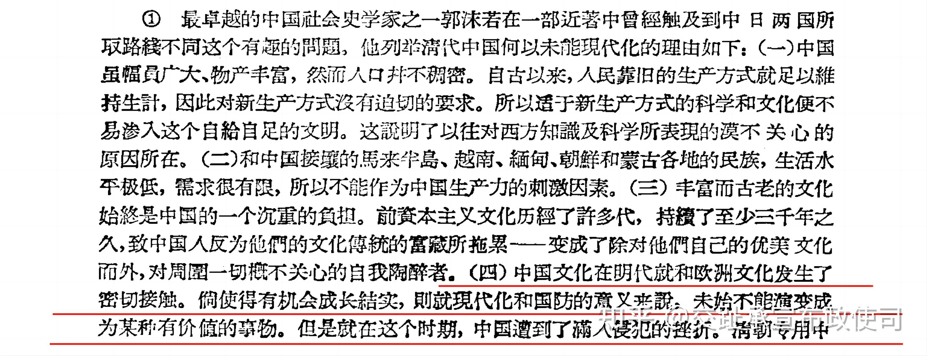 最卓越的中国社会史学家之一郭沫若在一部近著中曾经触及到中日两国所取路线不同这个有趣的问题,他列举清代中国何以未能现代化的理由如下:(一)中国虽幅员广大,物产丰富,然而人口并不稠密。自古以来,人民靠旧的生产方式就足以维持生计,因此对新生产方式没有迫切的要求。所以适于新生产方式的科学和文化便不易渗入这个自给自足的文明。这说明了以往对西方知识及科学所表现的漠不关心的原因所在。(二)和中国接壤的马来半岛、越南、缅甸、朝鲜和蒙古各地的民族,生活水平极低,需求很有限,所以不能作为中国生产力的刺激因素。(三)丰富而古老的文化始终是中国的一个沉重的负担。前资本主义文化历经许多代,持续了至少三千年之 久,致中国人反为他们的文化传统的富藏所拖累——变成了除了他们自己的优美文化而外,对周围一切概不关心的自我陶醉者。(四)中国文化在明代就和欧洲文化发生了密切接触。倘使得有机会成长结实,则就现代化和国防的意义来说,未始不能演变成为某种有价值的事物。但是就在这个时期,中国遭到了满人侵犯的挫折。清朝专用中国传统文化来统治中国,维持科举制度凡达二百六十年之久,其间中国的优秀人才都埋没到八股文中。反抗这种消磨志气的考试制度的人们(并且郭先生举了一些实例) 也只不过是掉头去钻研往古,穷究音韵,甲骨、小学之类的学问而已,此风迄今仍为中国文字学之累。一代的博学硕儒至多不过对中国古代文化生活的解释和分类有所贡献,殊不能迈过古代学术一步。由于清代的愚民政策,中国就这样蹉跎了三百年。