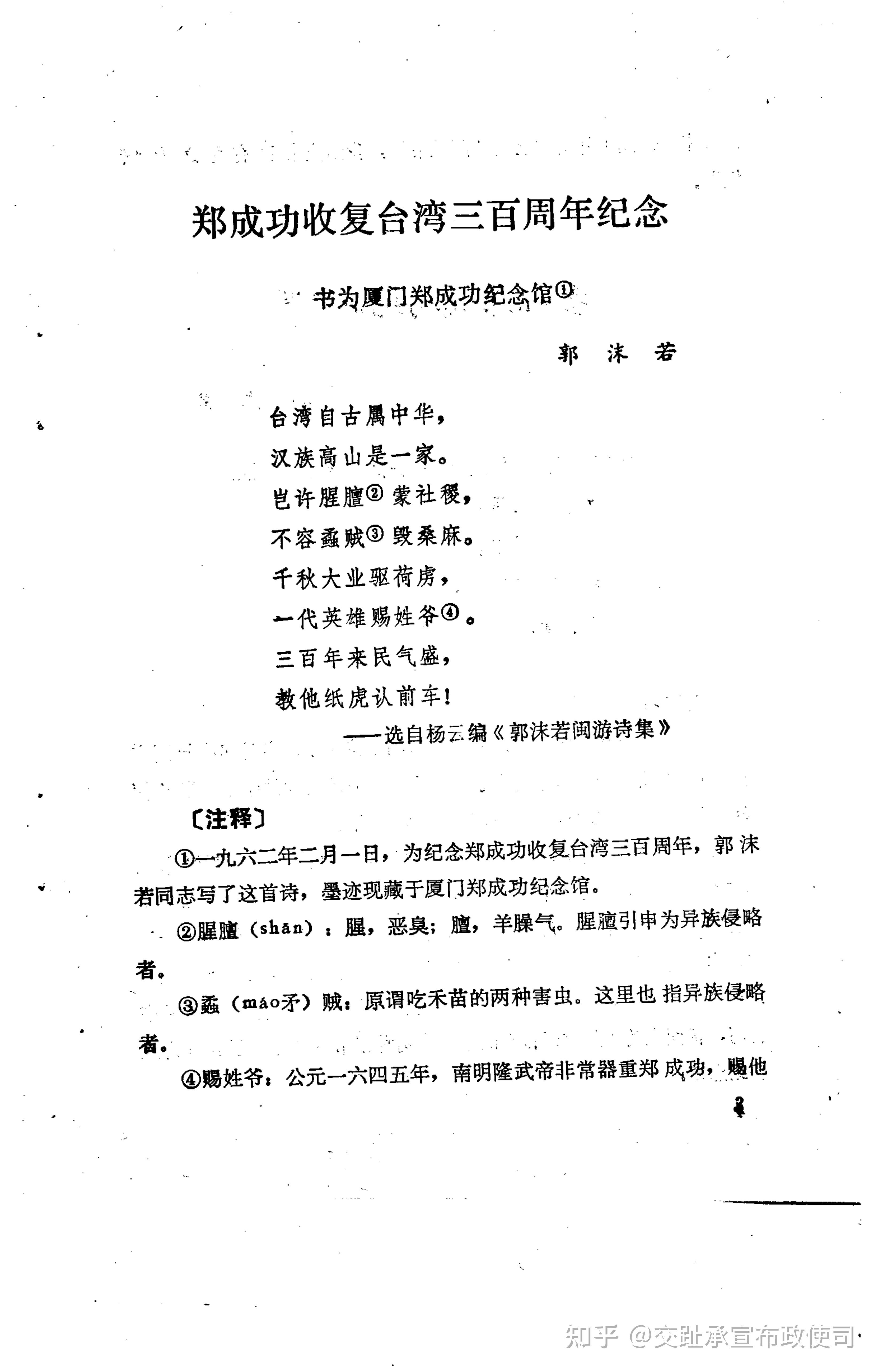 即使到了六十年代,郭沫若仍在坚持批判满清。比如在1962年纪念郑成功收复台湾三百周年的活动中,他为厦门郑成功纪念馆亲笔题写了一首七律,其中竟然用“腥膻”来形容我大清: