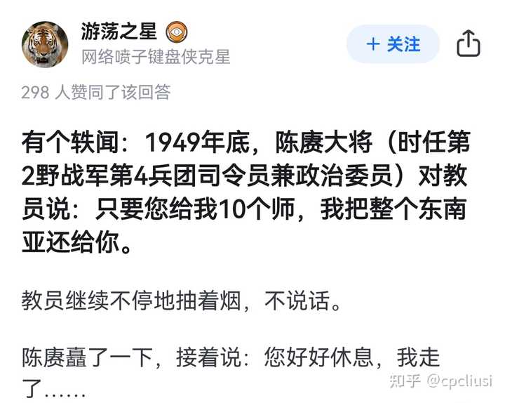 下图内容属于胡编乱造。原文是这样的:陈赓会见了即将随同308师开往越南的20多位中国军事顾问,作了一番鼓励。他第一句话就逗乐了众多部下:兄弟受中央委托,前来解决东南亚问题。东南亚问题不解决,兄弟我死不暝目。