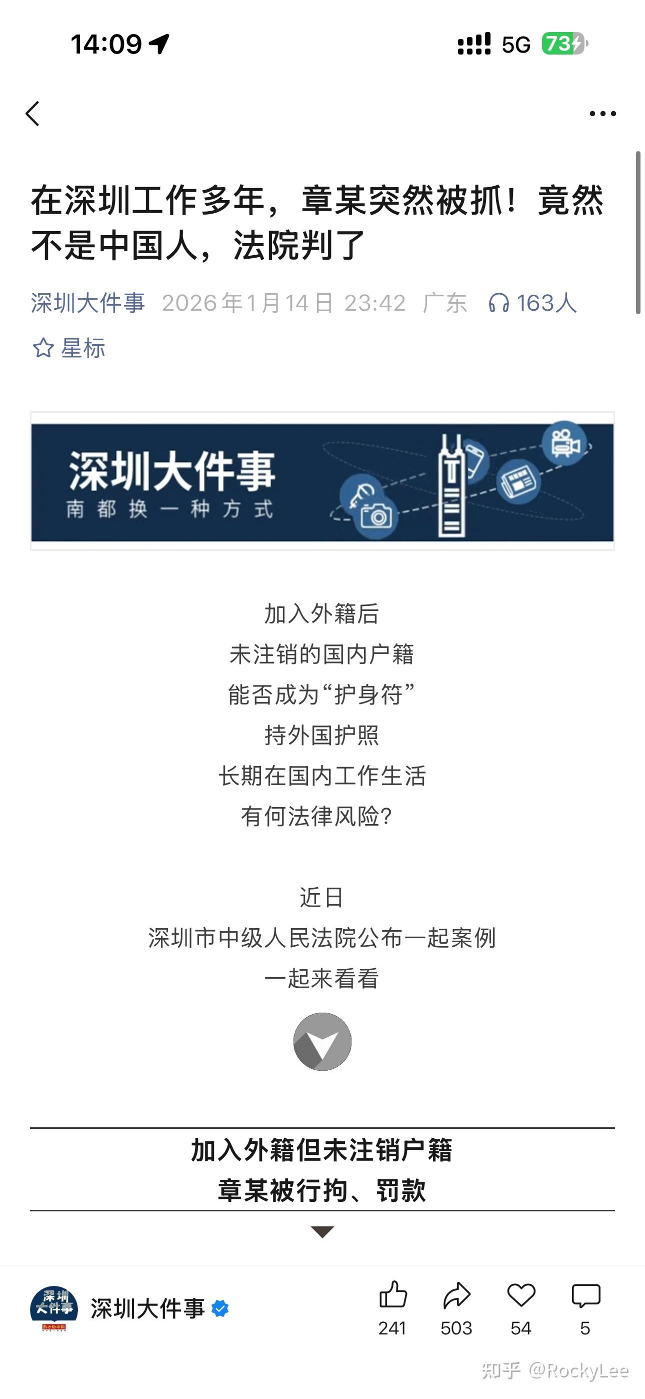 看了下没有最近那个加入新加坡国籍,未注销中国国籍,然后以留学归国人员的身份将户籍由N市迁入深圳市的章某被以非法入境被判了的新闻。