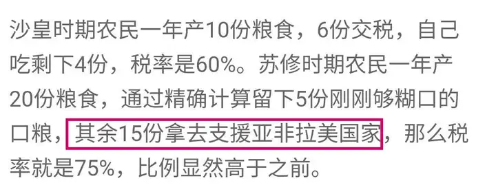 打个比方,沙皇时期农民一年产10份粮食,6份交税,自己吃剩下4份,税率是60%。苏修时期农民一年产20份粮食,通过精确计算留下5份刚刚够糊口的口粮,其余15份拿去支援亚非拉美国家,那么税率就是75%,比例显然高于之前。