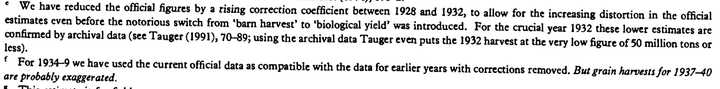但 1933 年以来的扭曲并不是故事的全部。 20 年代,准备谷物数据的统计学家试图获得谷仓收成的准确数据。 从农民那里获得的原始数据肯定被低估了,因此应用了“校正系数”,增加了根据农民的原始数据衡量的收成。 从 1926 年开始,这些修正系数几乎肯定太大了。 这些估计是在国家计划局的影响下进行的,该计划局认为革命前和革命后的粮食产量都高于竞争对手中央统计局的估计。 从 1929 年起,统计人员受到强大的政治压力,要求通过进一步提高修正系数来“改善”粮食生产。 因此,我们认为 1926 年至 1932 年的所有粮食数据都需要按年度百分比减少,并在此期间系统地增加。 1932 年收成档案中的数据显示,集体农庄的每公顷产量和实际收割的播种面积都大大低于用于估计粮食产量的数字; 1932年的收成可能只有50-55百万吨,仅占官方数字的72-9%。”根据我们的临时估计,1930-2年的粮食产量已经夸大了约20-30%,因此 1931年和1932年的收成低于除1921年饥荒之外的任何革命后年份。苏联公布的数据中并未对公布的数字进行这些减少,但我们在自己的估计中进行了减少。简而言之,苏联官方的数据中包含两项造假方式:因为农民可能低报粮食生产数据逃避官方粮食征购,故引入了“修正系数”来高估粮食生产水平,但这反而可能夸大粮食产量;而从1934年开始,官方开始逐渐使用田里的生产数据直接当成“粮食产量”而非正常国家统计中的谷仓收纳量,那些散落在地里未收割或者沿途撒落无法利用的粮食也被计算在内。第二项造假在shi大淋去世以后被重估了,然而由于1937年以后苏联官方的夸大相当过分,因而后来的修正数据很可能也未能反映真实的粮食产量。