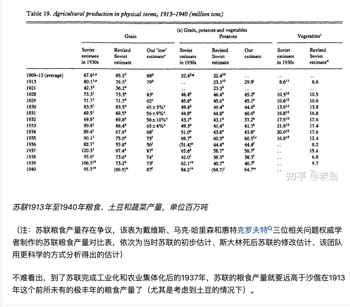 反复宣称的“这张表告诉我们,1938年及之后苏联完成工业化以后粮食产量就已经超过沙俄了”)那这张表能证明苏联的粮食生产比沙俄强么?真的像