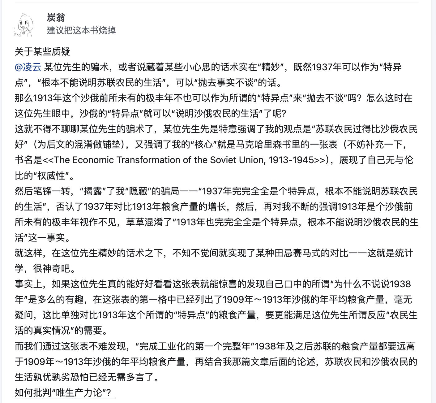,包括不少人应该都见过这一类ID,在什么苏联如何如何,前XX年如何如何一类问题下的回答,风格都很类似———中文英文俄文无所不包,资料详实,论据丰富,数据表格满满当当。给出来的结论当然基本都是些“历史真相”,比如苏联比你想象的牛逼多了,shi大淋时代就能开始明珠了,人人都能吃饱穿暖生活幸福,70年代就能造芯片了云云。这些文抄公的水平高明吗?其实低劣的可笑。随便什么人,只要有大学英语4级的水平,再有点正常上网的能力,翻翻喂鸡百科,找数据的脚注,如果是网站可以直接上,是书名就到电子书网站碰碰运气。甚至你也可以上俄文维基,反正现在翻译软件也做得很好。另外还可以经常去逛逛贴吧,再加几个所谓“大佬”的扣扣群,保存一下其他文抄公贴出来的截图,不用几个月你也就能成为“聚聚”、“大佬”中的一员。可以说,是一种很低成本满足虚荣心和自尊心的方式,非常适合各路闲的没事干的高中生、大学生or社会闲散人员在赛博空间里找存在感。