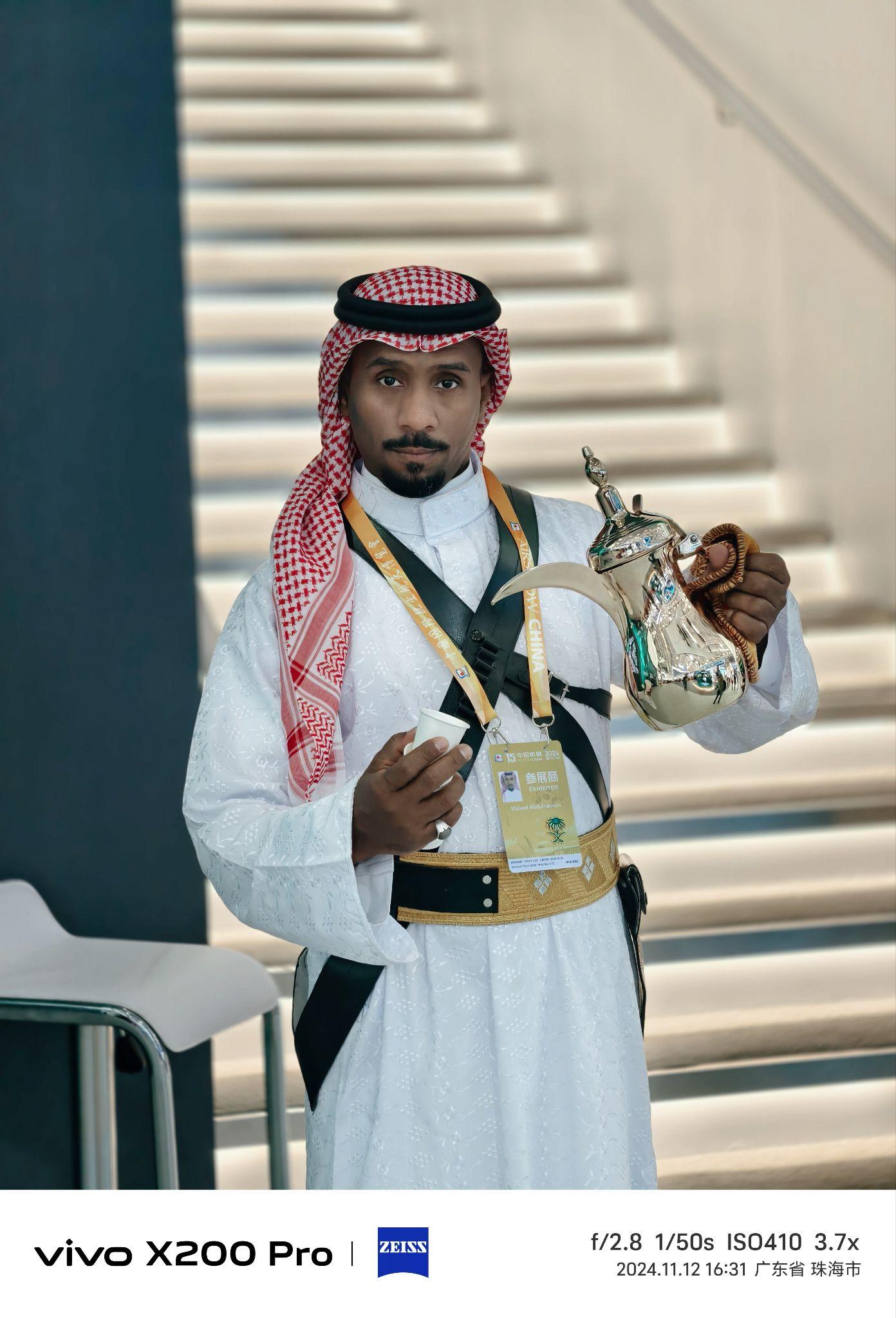 第一次是昨天到展厅时候,看到端着异域风情的咖啡/茶叶壶的白袍男子感到是很有趣的,就过去拍摄他,他正好迎过来,我就配合了一下他的热情,给我倒了一小杯,我闻了一下,没有特殊的香味,就好像是红茶一类的。