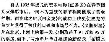 意思就是,这是内地第一部真正以‘’贺岁片”名义,在大年初一开始公映的电影,而且因为掀起观影热潮,从此开启了内地春节档的市场;换句话说,之后所有大年初一内地公映的春节档电影,《红番区》都是它们的“大祖师”!