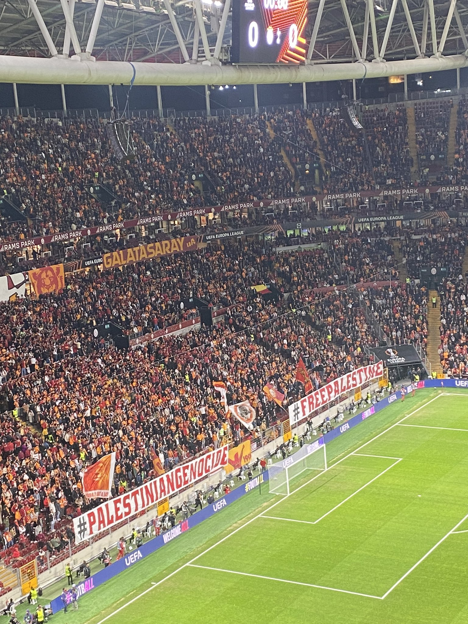 要是欧足联仍然把这场比赛定在土耳其,那乐子真的就多了,贝西克塔斯球迷也不多让。贝西克塔斯球员在场上公开打出支持巴勒斯坦的标语和手势,贝西克塔斯球迷更是雷打不动全场张贴支持巴勒斯坦标语。