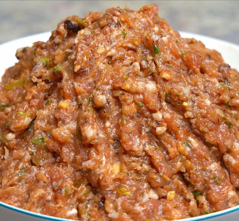 肉馅剁好后,料水分3次加入,每次加入1/3,朝同一个方向搅拌,水完全吸收时再添加下一次,第三次加水,明显感觉肉馅粘稠拉丝有阻力、筷子夹起来沉甸甸有光泽就可以。
