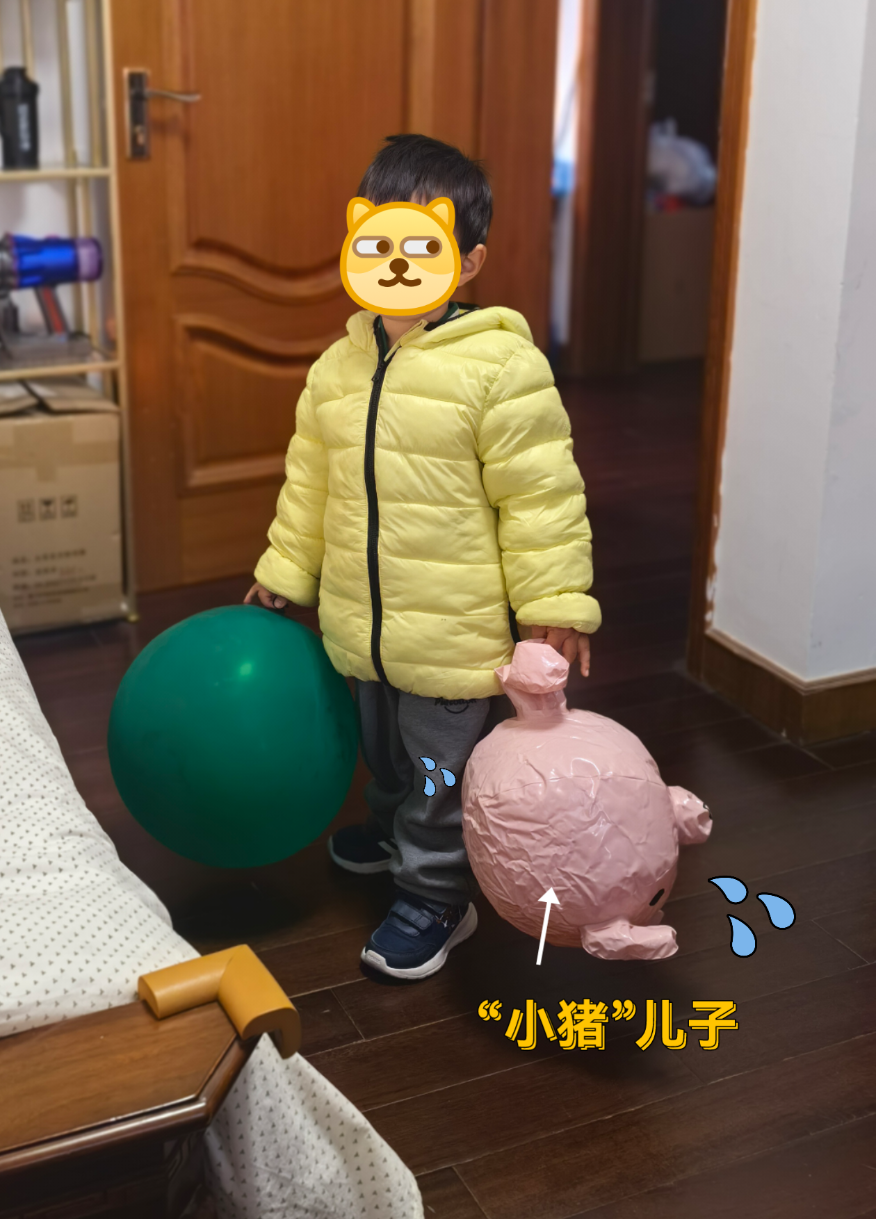 原来是我妈跟他玩气球的时候,玩好了想把气球收起来,于是就告诉他:小猪要回家去找爸爸了,找不到爸爸小猪要难过的…