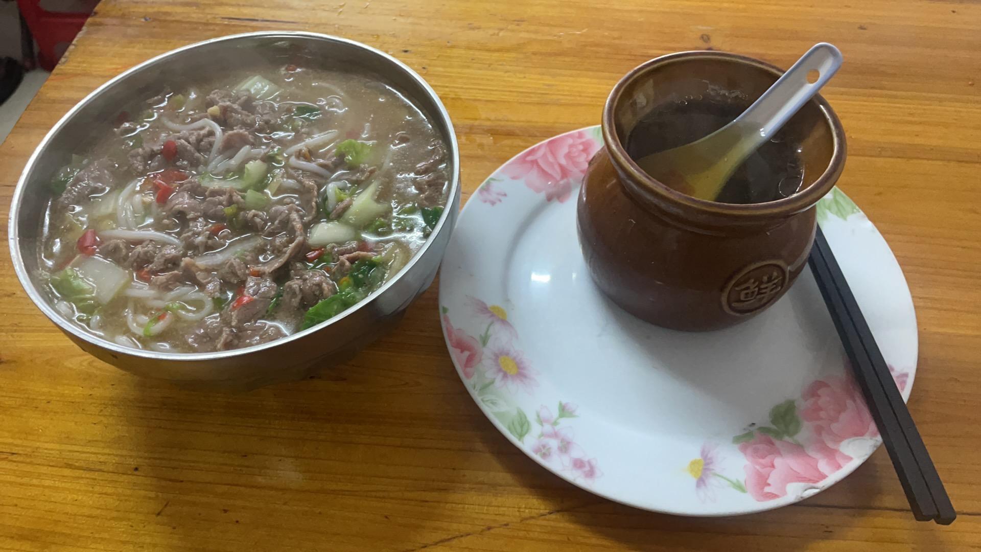 起先是和我瓜兮兮的恋人自驾重游江西三清山。途经抚州某县城住了一晚,翌日出发前我拉着他去当地小巷子里找地道的美食,找到了一间看起来不错的早餐店,店里没其他顾客,我点了一份汤,他要了一碗面,老板娘刚端上来,他就接到要挪车的电话,离开了一会儿。