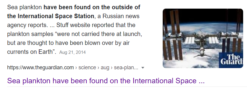 - 2014 年,俄罗斯航天员称发现国际空间站外壳上有来自地球的海洋微生物。运载该舱段的俄罗斯火箭从未在海洋上方低空飞行。航天员估计,这些微生物是被偶发的气流带到太空并附着到空间站上、在真空中扩增的。