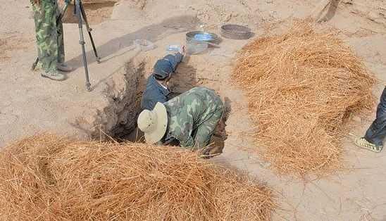 在7号墓葬,考古人员清理了表层的泥土后,厚厚的麦秆数量让他们惊讶。这些麦秆足有10厘米厚,有的麦秆上还有完整的麦穗,呈金黄色,其新鲜程度如同刚刚从地里收割一样。在麦秆下面是15到20厘米的骆驼刺,下面才是完整的墓葬。考古人员分析,这些麦秆是用来充当铺盖墓葬的填充物的。