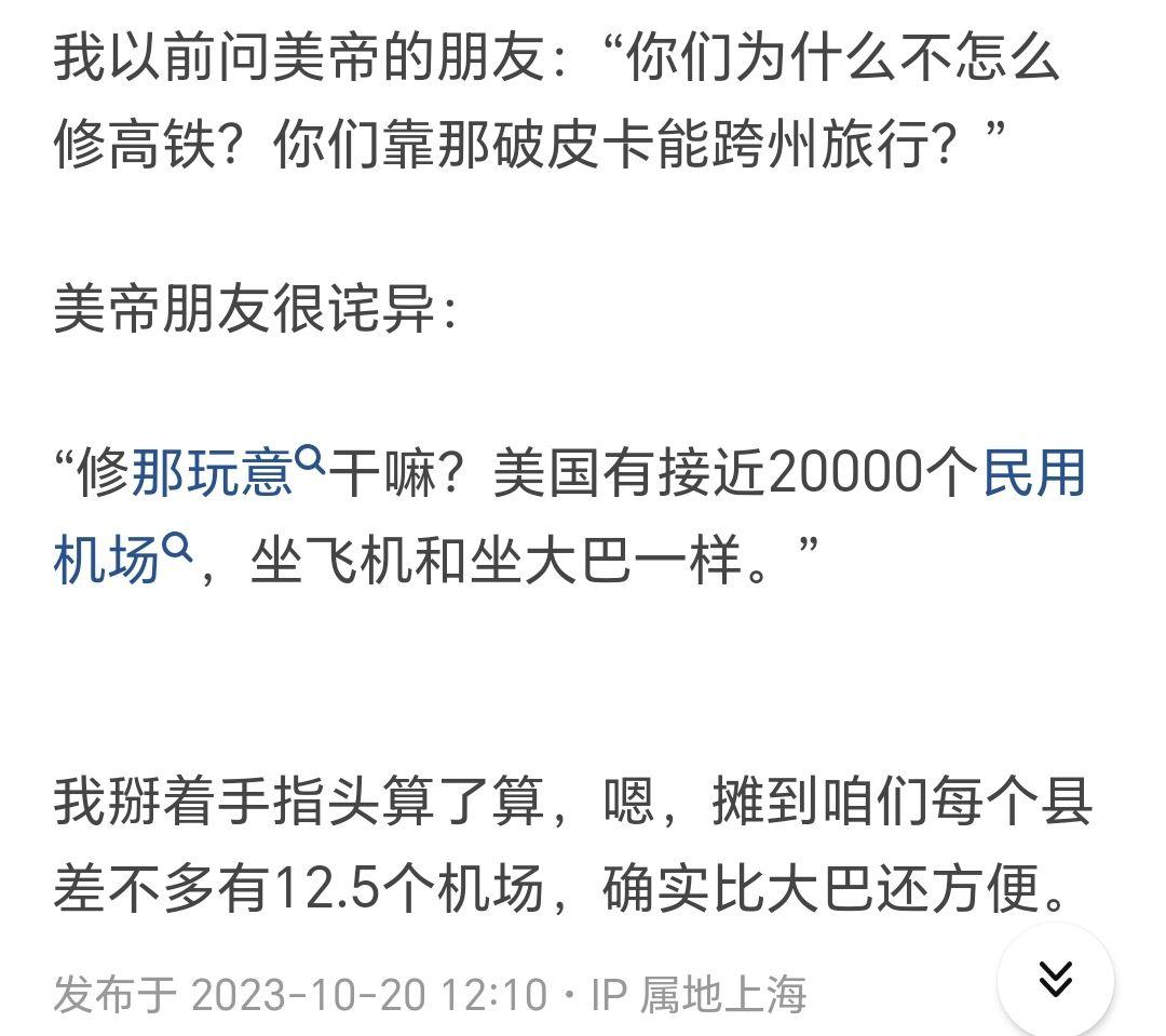 美国的航空业规模远大于中国,平均每人每年坐飞机出行的次数是中国的五六倍。这是客观事实。因为美国人均GDP本来就是中国的五六倍,70%的中国人从未坐过飞机,而美国这一比例是18%。