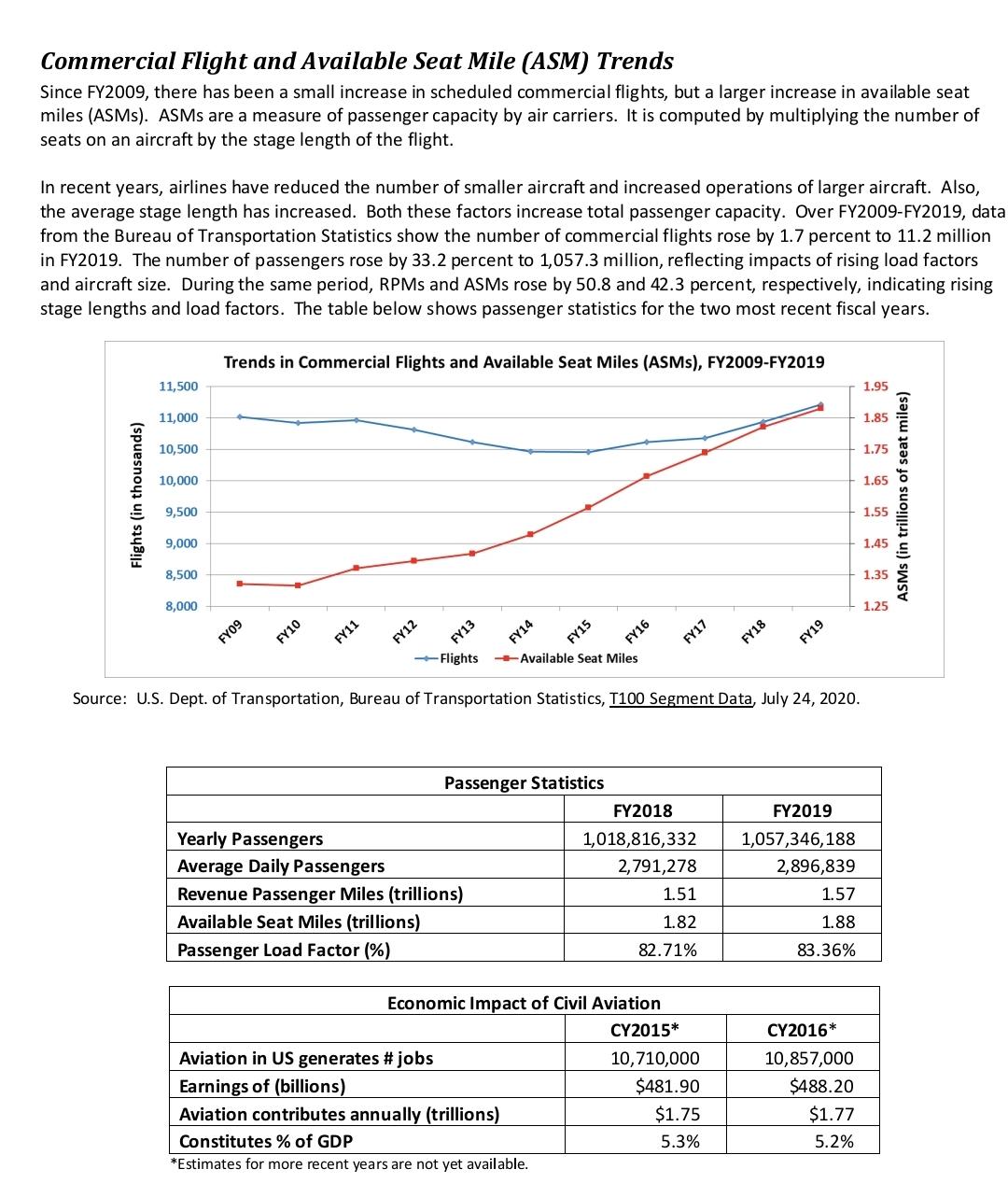 2019年旅客数10.57亿人次,年旅客周转量1.57万亿人英里,客均旅程2390公里。总航班(统计口径为commercial flight)1120万班次,其中定期航班1039万班次,平均旅客数101.7人/班。