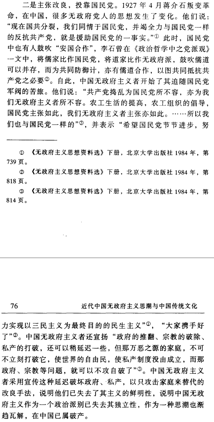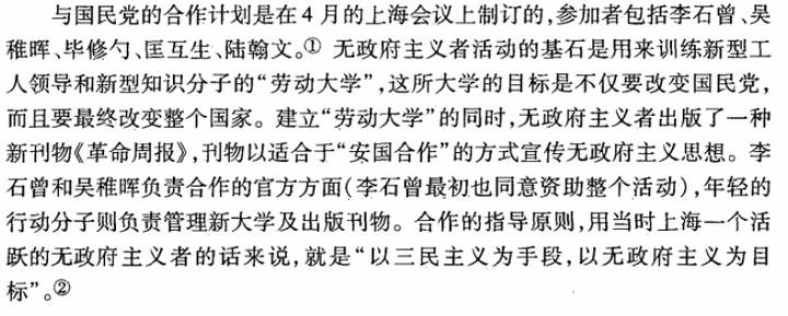 《中国革命中的无政府主义》 显然,元老们对蒋介石的支持让无政府主义者们在国民党的立场上更进了一步,开始了“安国合作”