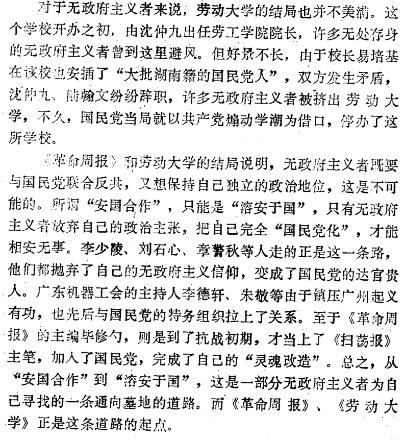 《中国革命中的无政府主义》 不言而喻,所谓的“劳动大学”根本没有什么未来可说,等待这些走狗的,也只有“溶安于国”,彻底成为反动派的一员