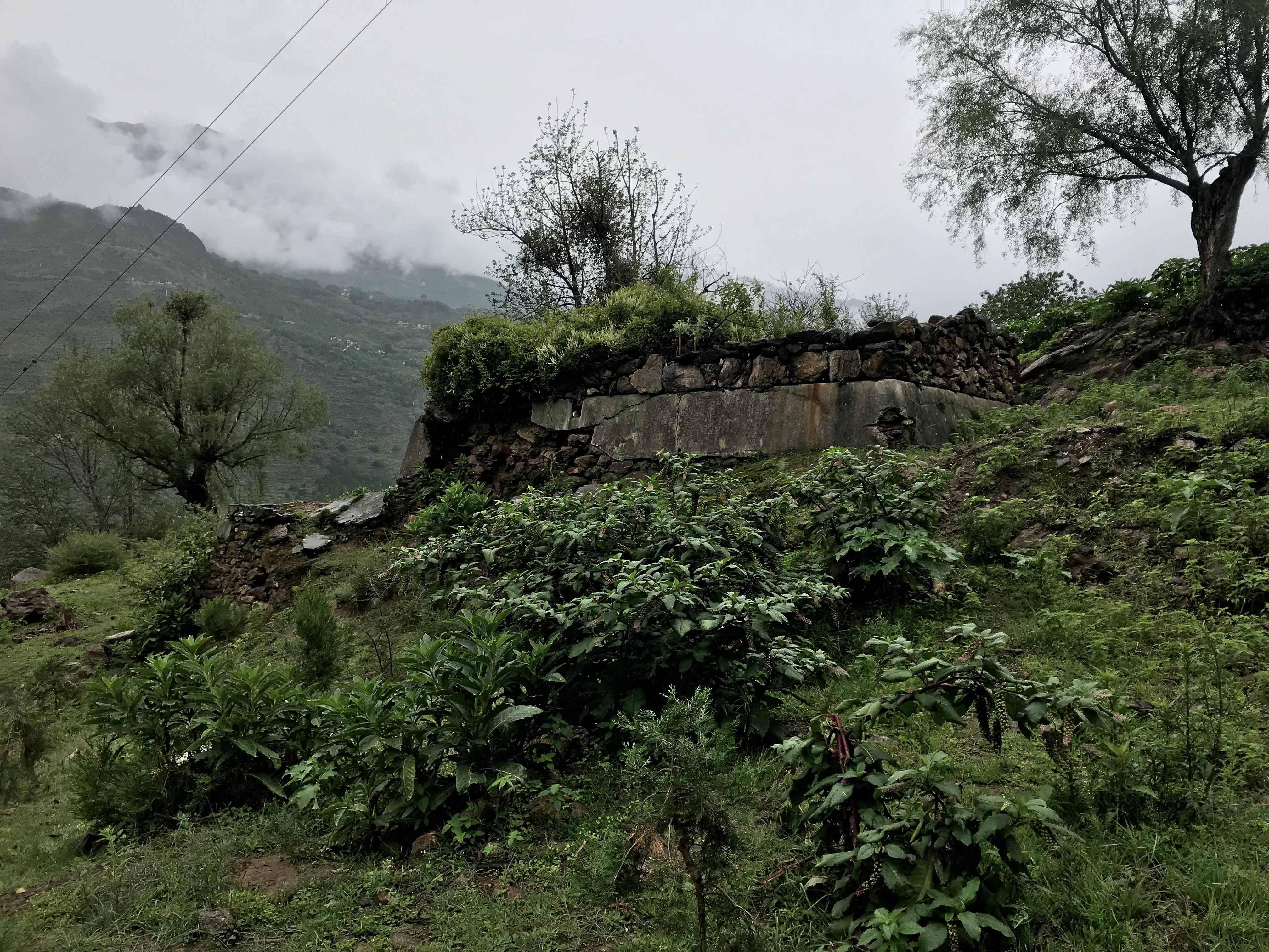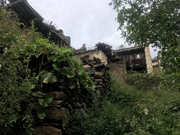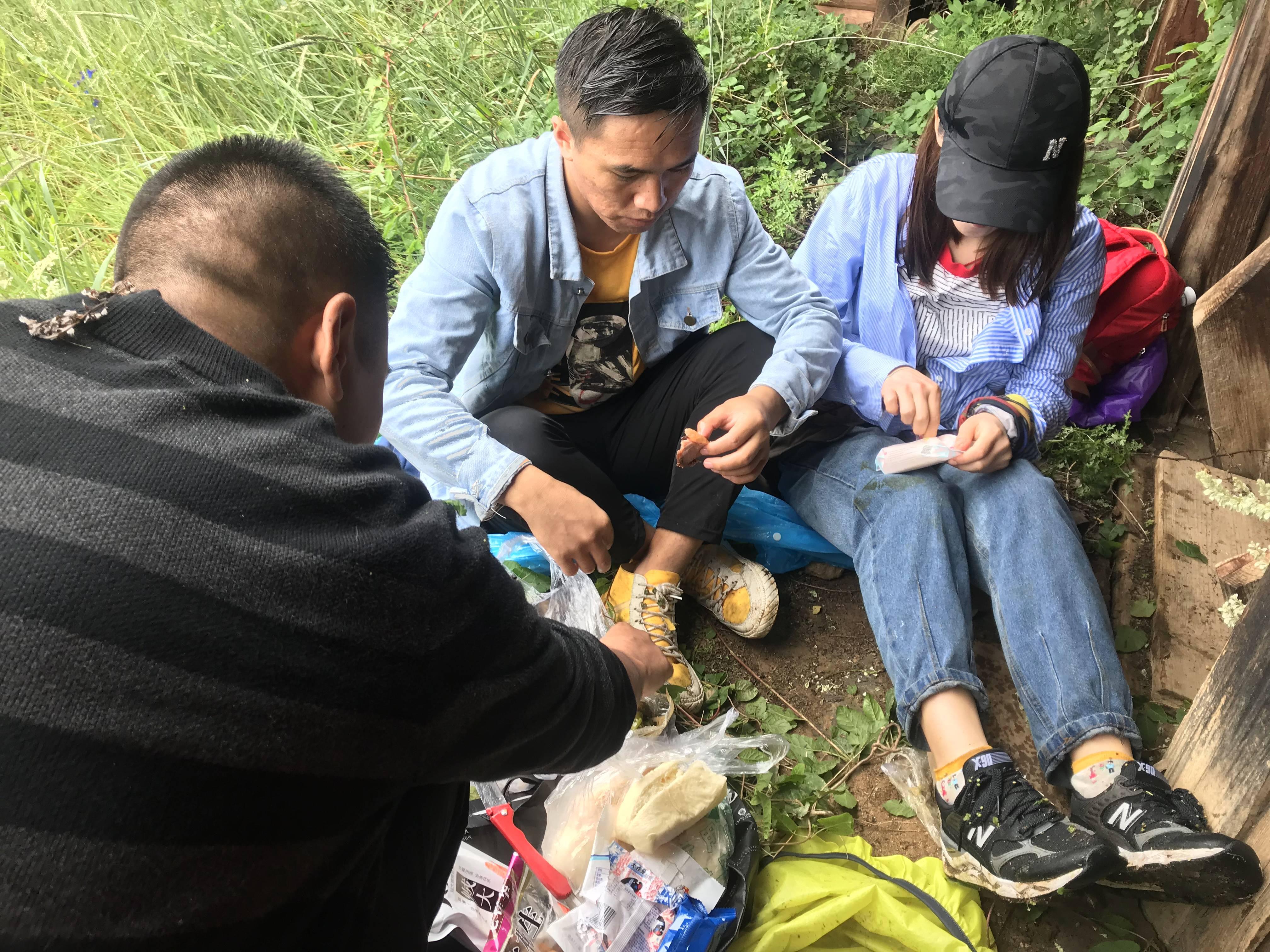 到了目的地,有从前矿工垒的石头小屋子。那山上有矿,九十年代矿枯竭,这些屋子就废弃了。我们不敢进去躲雨,因为这种地方也是蛇、蝎子、蝙蝠爱住的。我们找了一处年代比较新的房子,估计8、90年代还有人住。因为有女儿墙挡着,山顶风特别大,雨是横着下的,所以房顶有一半区域略干燥,我们爬上房顶坐着休息。