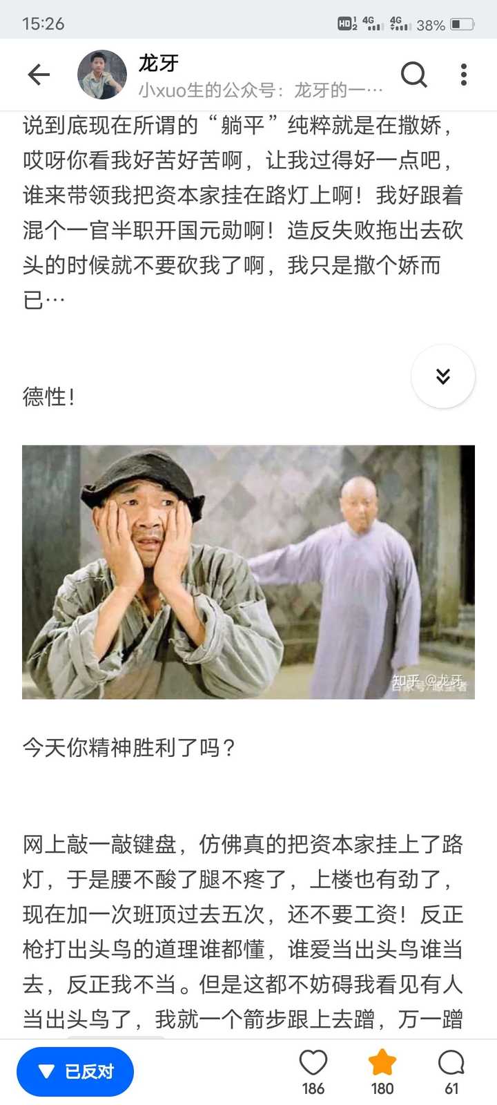 结果 来了句:真躺平了就不应该上网,真躺平了亲爹打断腿都起不来,现在喊躺平的都是别有用心,都是境外势力,都是机器人。是的,只要打倒境外势力,这个问题就不存在了