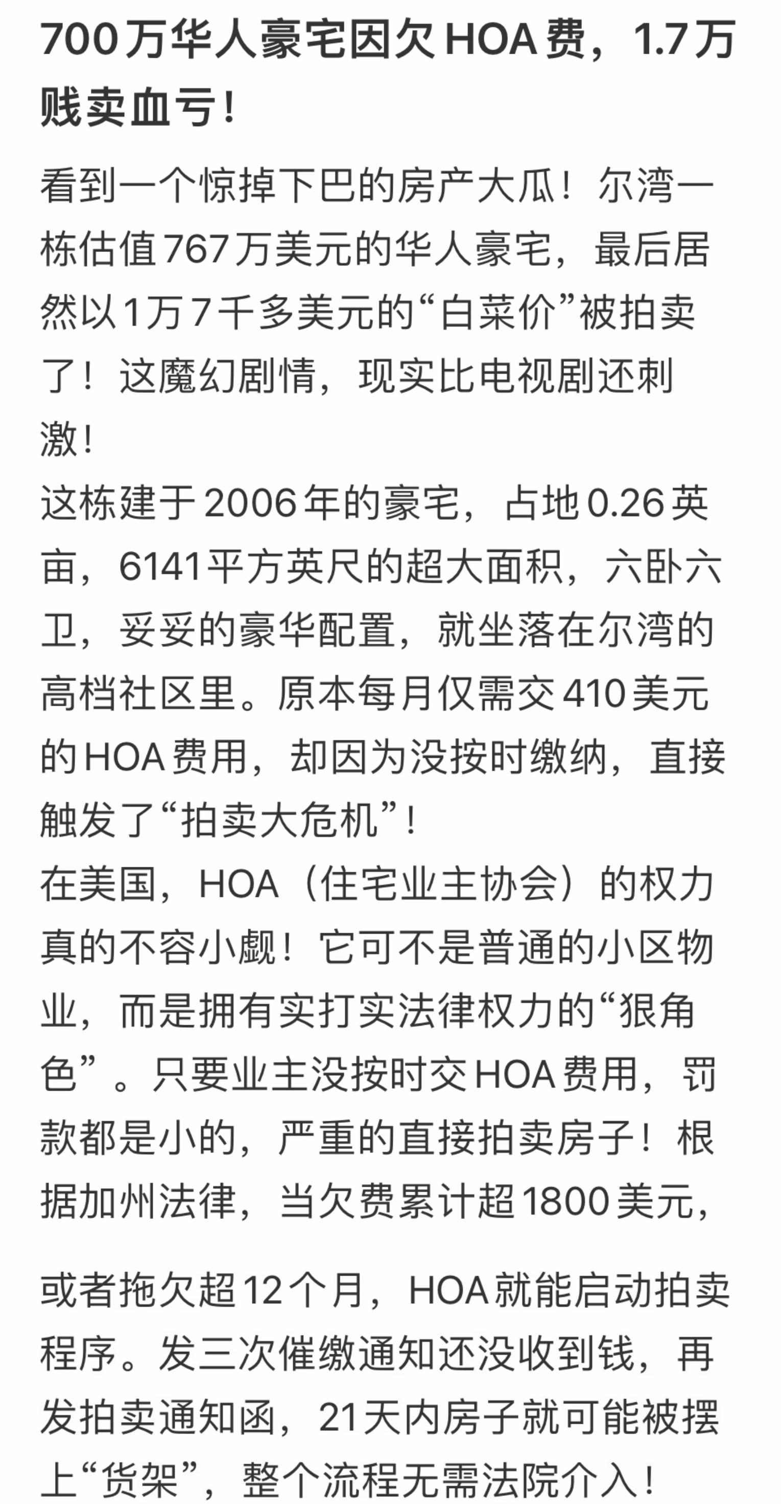 刚看到一个新闻,加州尔湾有一栋价值700多万 的房子,因为没交HOA费,而被以1.7万 被拍卖走了。所以在美国,不但没交房产税,房子会被收走拍卖,没交HOA费,也会被收走拍卖。 永久产权,不过是永久租金,以及被方便收走拍卖的幌子,你信这鬼话? 发布于 2025-06-24 06:19・北京 赞同 5369 条评论分享 收藏喜欢 收起