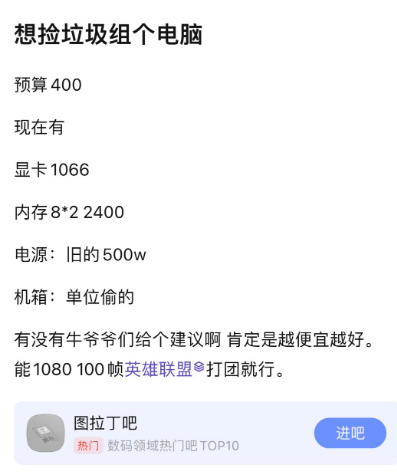 在诸多垃圾佬聚集的图拉丁吧,你可以看到许多人拿着自己精心调教的配置单向大佬们讨教如何再抠出点预算,可定睛一看价格,总共才400元。