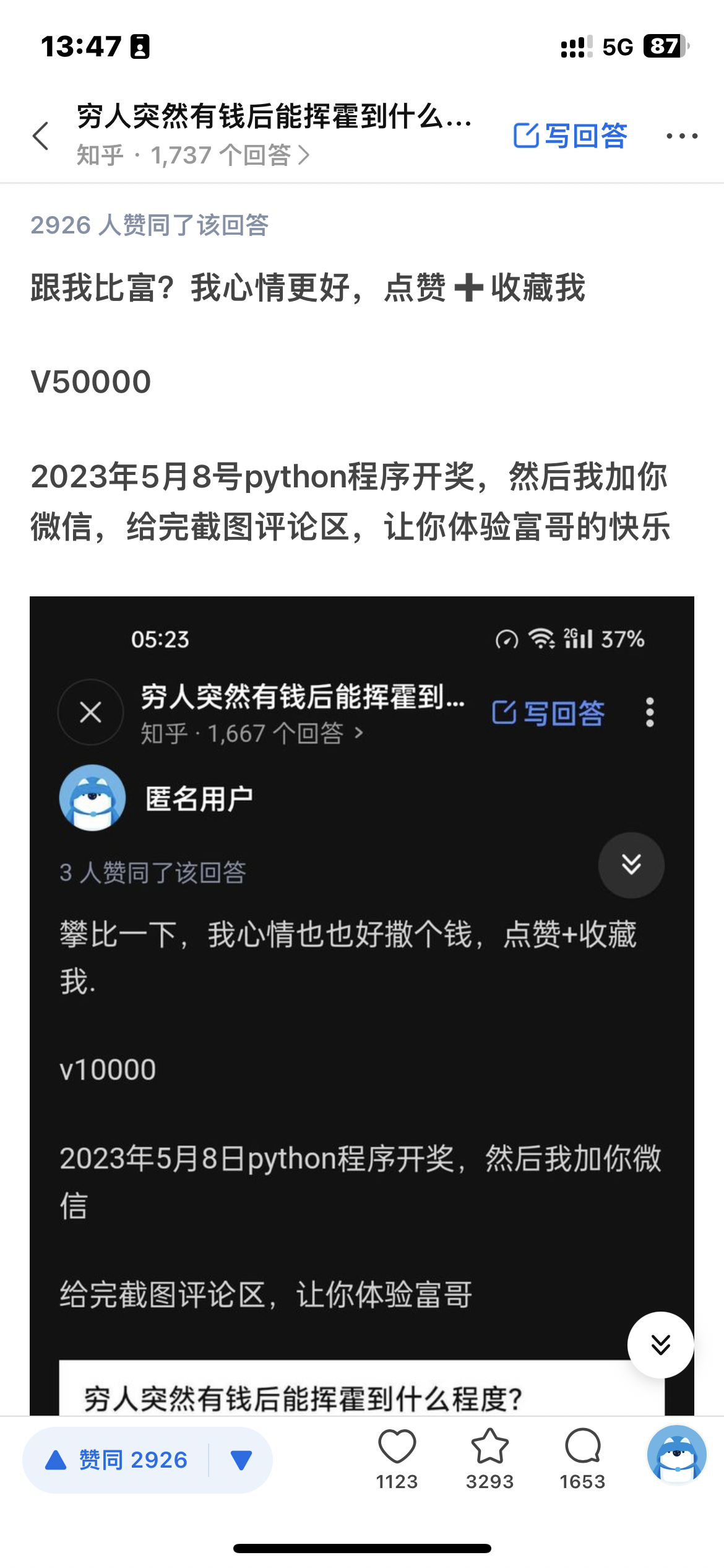 跟我比富?我心情更好,点赞➕收藏我 本来想V一个50w的,但是你们太卷了,还是v十亿加蜗牛吧 2023年5月8号python程序开奖,然后我加你微信,给完截图评论区,让你体验富哥的快乐 编辑于 2023-04-10 14:43・IP 属地广东 赞同 2193329 条评论分享 收藏喜欢 收起