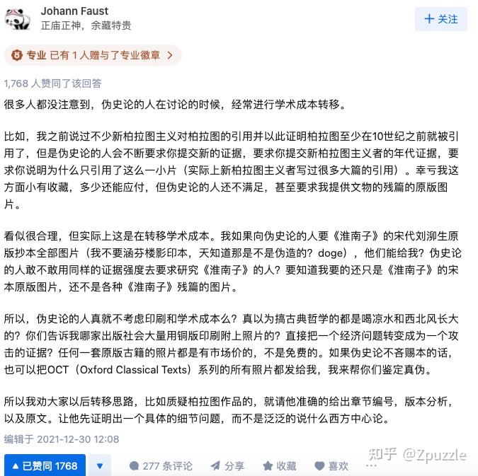而一边说着中国的学者迷信西方,一边又连一张羊皮能写多少字这种问题都不去想,只知道跟在别人后面复读“羊不够用”,还认为自己一下子击中了“伪史”的要害——连我这种外行都能看出来“羊皮不够”说的可笑,正经的历史学——尤其是古典学的研究者能认真看一眼,就是他们输了。