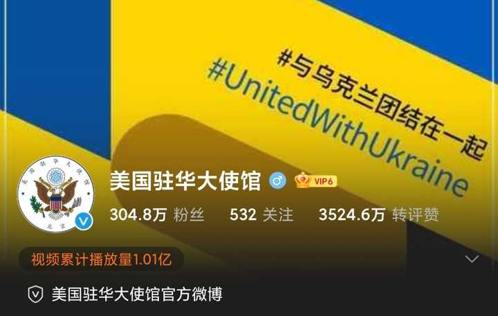 美国大使馆微博截图。猜猜那些顶乌克兰国旗的账号哪来的 我不指望这一招能够彻底干掉知乎的1450网军——毕竟有国内vpn,而且广义1450中本来就有很多恨国党在国内领美元。