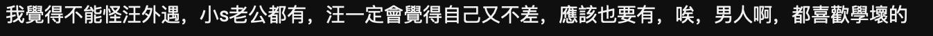 我看台综,其实感觉他们台湾娱乐圈那些综艺咖们,最大的特点就是,没文化,三观破碎。男的耍酷把妹为荣,女的把抢人老公、男友当成有本事。大小S姐妹淘里的好姐妹们,当小三的、未婚生子想上位的、嫁神棍的,也不是没有。这也是我为什么觉得真情实感吃瓜站队骂渣男捞女的网友有点大可不必,因为你跟人家根本就不是一个三观评价体系的。