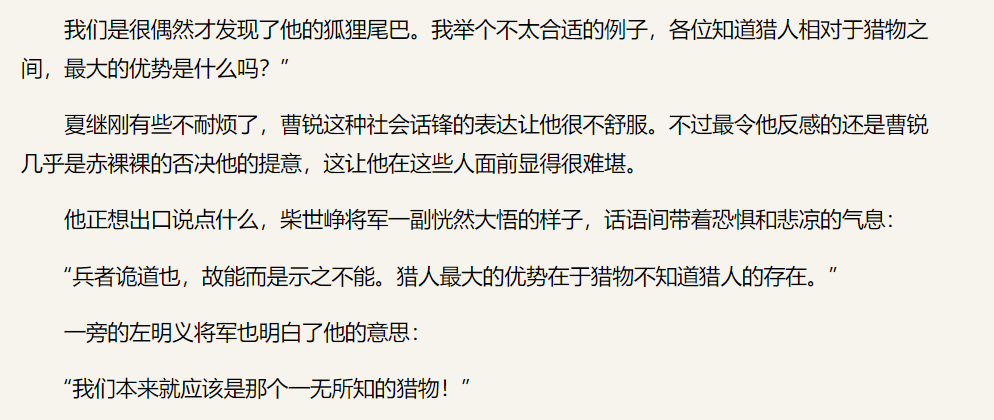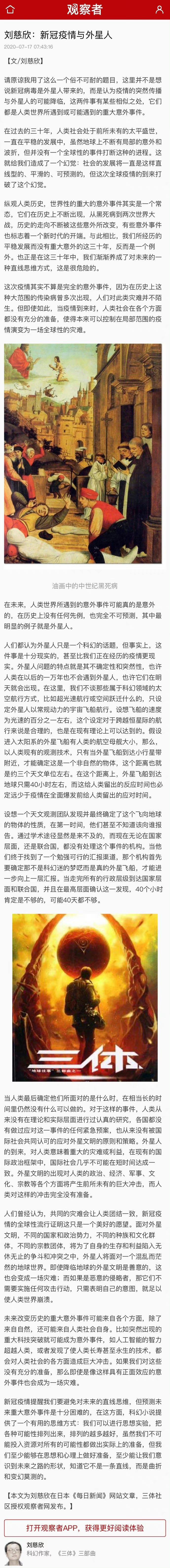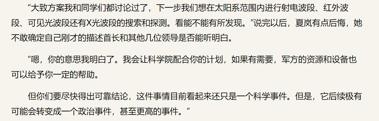 “是的,我想这意味着某种基本的善意。毕竟以这样的能力——我不是指发射信号的技术,而是指在这样的距离上发现我们的技术以及主动向我们揭示自己存在的自信——恐怕要对我们发动对ta们足够安全的先发制人的打击应该不算困难。”