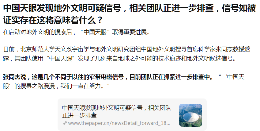 又2天后,中国天眼工程不鸣则已一鸣惊人,报告发现了可疑的地外文明候选信号。