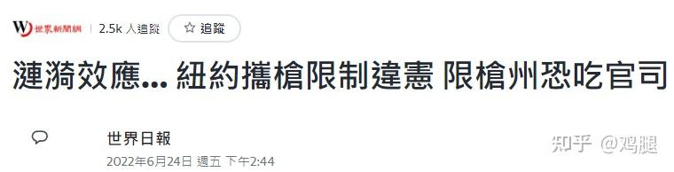 最高法院23日推翻紐約州要民眾取得地方官員許可,才能不公開攜帶手槍的州法,很可能產出漣漪效應,波及全國,尤其是幾個限制擁槍權的民主黨主政州;紐約州雖不甘示弱,揚言要找新方法限槍,但這類措施可能會吃上官司,後續發展有待觀察。 華爾街日報(WSJ)報導,最高法院的判決指出,紐約州行之以久的州法,要民眾必須取得許可,才能不公開攜槍,讓地方官員取得太大的裁量權,違反憲法第二修正案。 至少加州等6州限槍 紐約州官員立即回應本判決,聲稱要找新的限槍方法;州長霍楚(Kathy Hochul)稱紐約州相信有權因場合而限槍,非針對個人,而是要看場合;有些地方帶手槍實在格外危險。