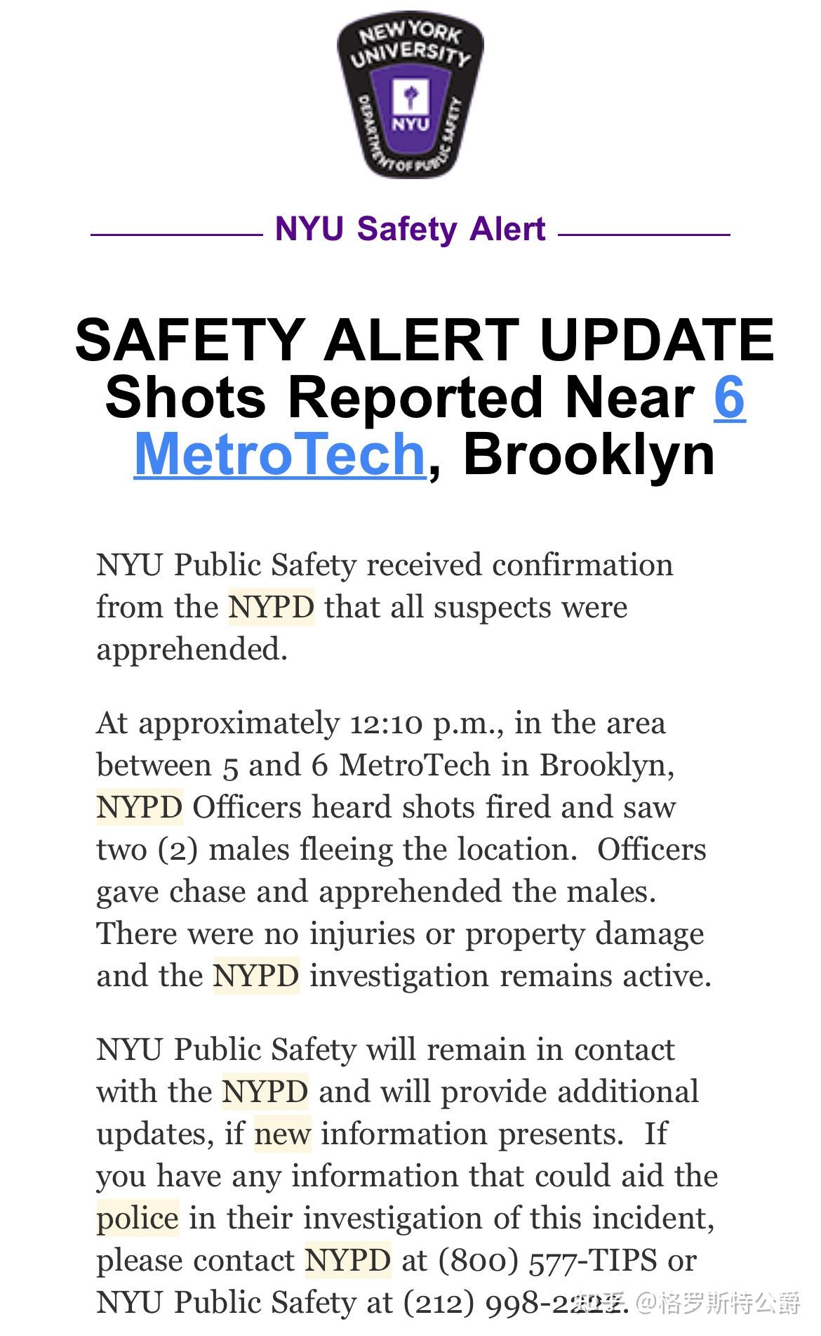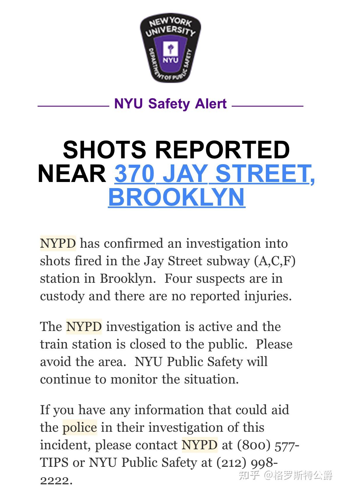 第一起发生在图书馆门口,当时我正在Jay Street的教室内上课,随后收到了NYU Safety和NYPD发的安全警示。