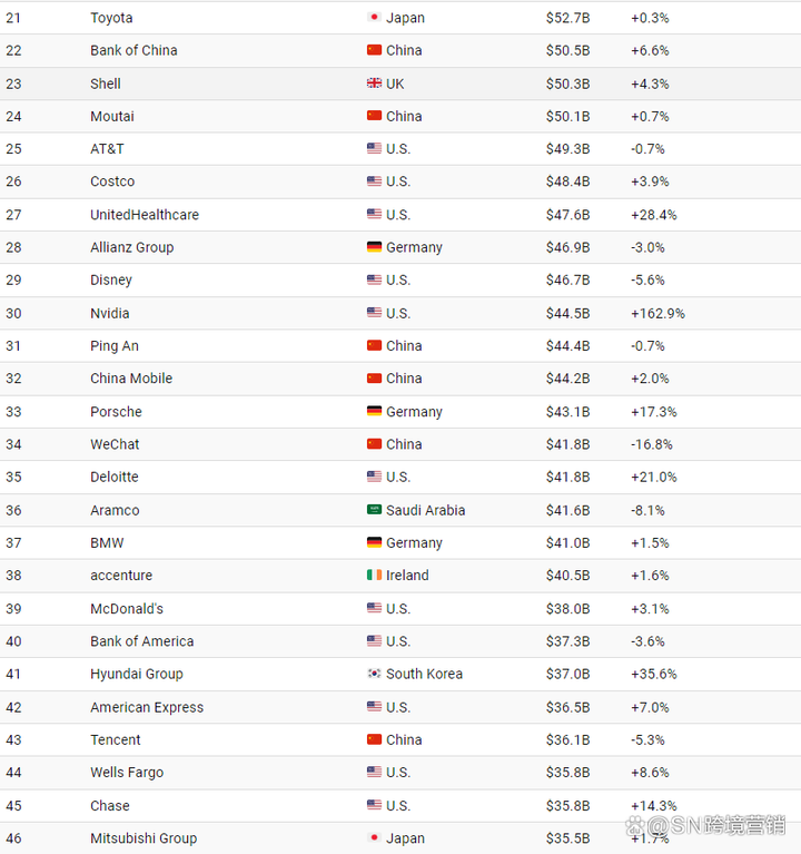中国出场的除了抖音,腾讯,微信等互联网企业,剩下的就是五大行,三大运营商,两桶油,国家电网等行政垄断企业,高下立判。