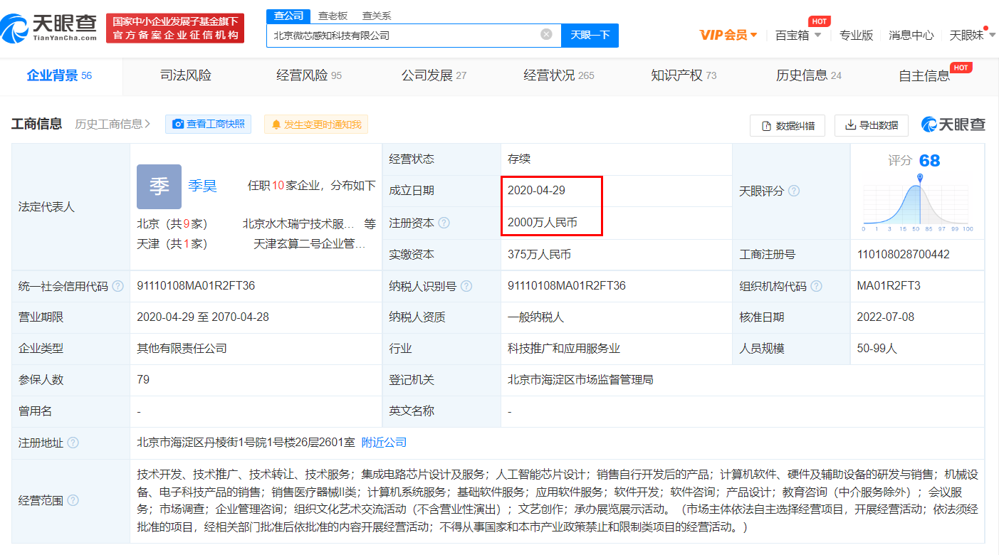 天眼妹查了下这家监测手环背后的公司——北京微芯感知科技有限公司。该公司是2020年4月份成立的,注册资本为2000万。