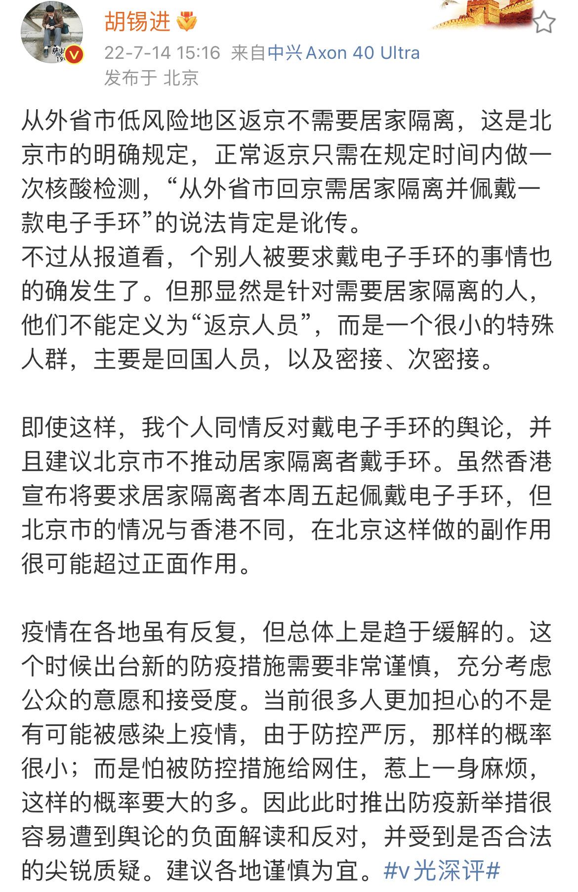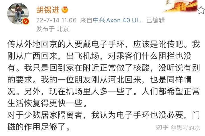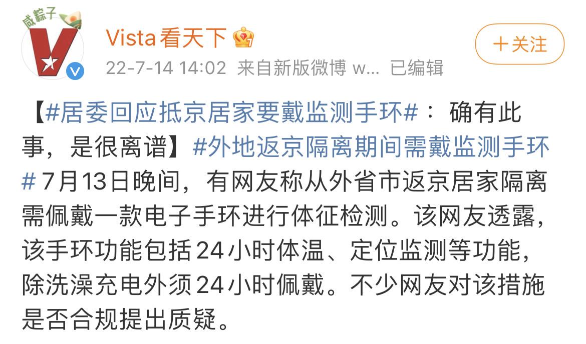 居家隔离,本来也是一种强制措施,用带手环的方式可以保证措施得到100%执行,也极大地减轻了监管难度,提高了工作效率和效果;同时,这样的措施也完全不妨碍个人的隔离生活,有什么“离谱”?!!!这项政策当然有一定效果,但是我并不建议直接有居委或者区来制定,而应该由北京市统一安排,这样更有序,避免层层加码。同时,如果要实行的话,就应该提前通知,发布公告并让还未来京的人员事先知晓,而不应抵京之后再通知甚至半夜紧急通知。