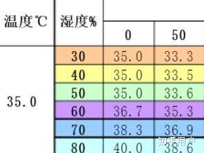 如下表,同样的空气流速情况下,湿度越高,体感温度越高
