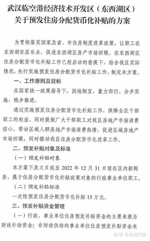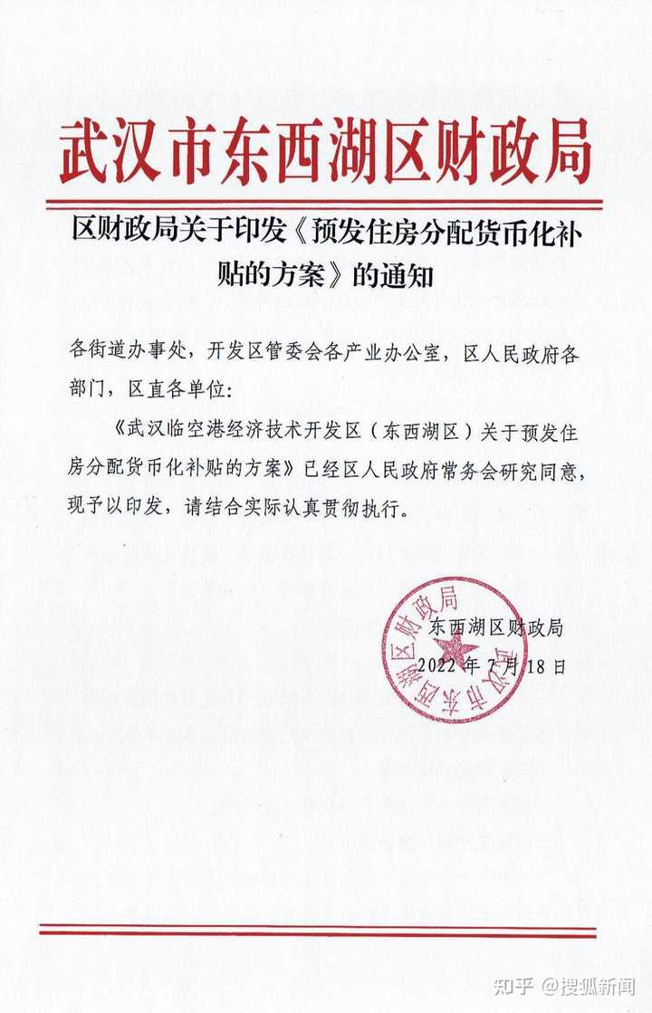 日前一份武汉市东西湖区财政局印发《预发住房分配货币化补贴的方案》的通知在网络流传。该预发补贴方案的主要内容是:属于住房分配货币化补贴政策对象的行政事业单位职工,...