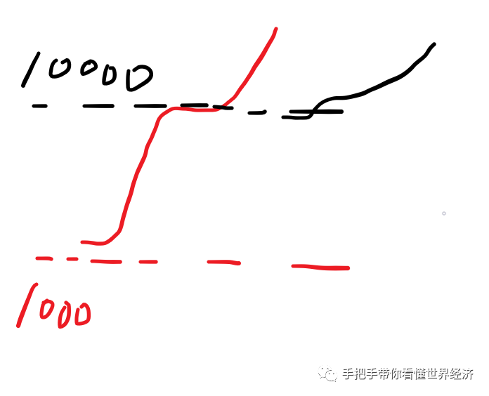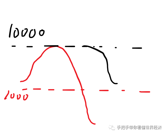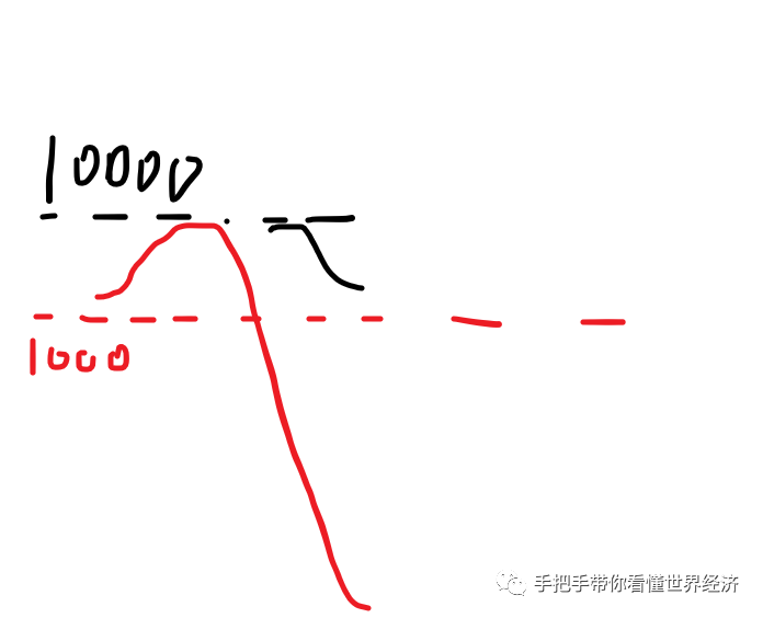 就是现货市场价格在1000元以下的下跌幅度,甚至大于期货市场上从10000元开始下跌的总幅度,就像这样: