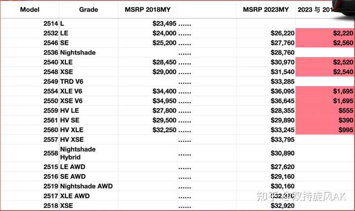 美国的车价还有个特点,就是无论增配减配,每年的小改款都要涨几百刀(这点和疫情后的通胀无关)。8代凯美瑞指导价从2018款的23495-34950美元,提升到2023款的26220-36645美元,而且涨幅最大的是走量的中低配车型,足足2500美元。雅阁更狠,低配比5年前涨了3700美元,顶配涨了3200美元。