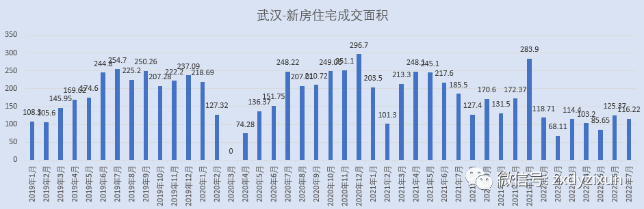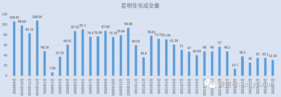 天津、太原、武汉、昆明、南宁新房销售面积走势非常明朗,天津新房成交量在7k套左右,太原新房成交量在4k套左右,天津人口1300w,太原人口530w,天津人口是太原的2.45倍,天津新房成交量是太原的1.75倍,那么肯定意味着太原的新房销售量还有下跌空间。8月第一周太原新房销售面积回落至6.41w平,2022年32周平均成交量为6.31w平,即从第22周的反弹持续回落10周,回落至全年平均线附近,按照第一周成交数据计算,8月份预计成交面积为25.64w平。